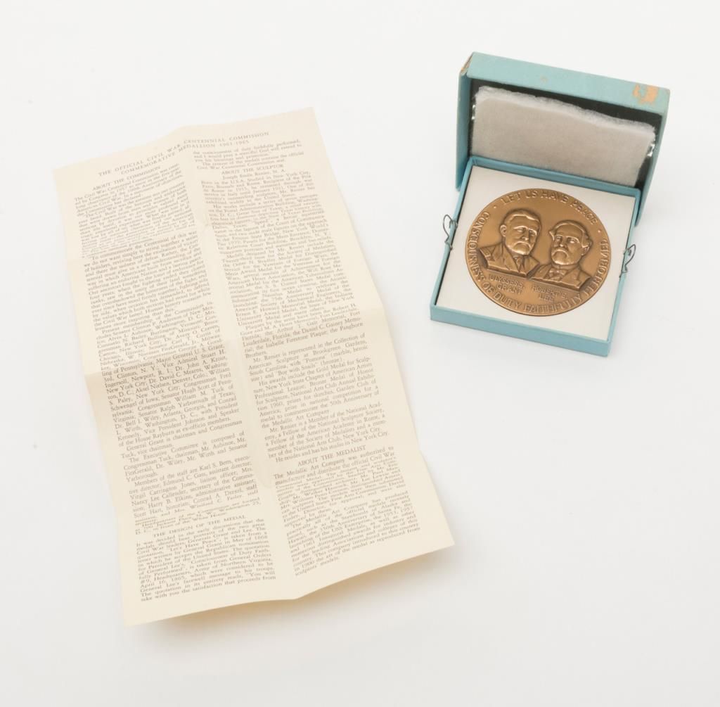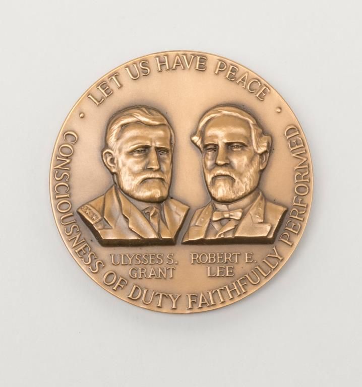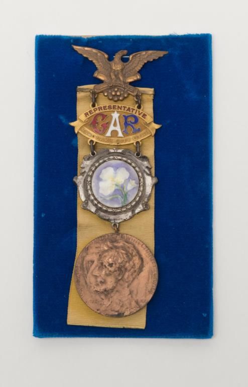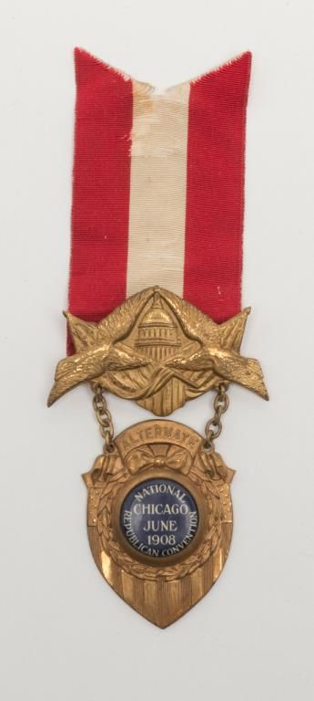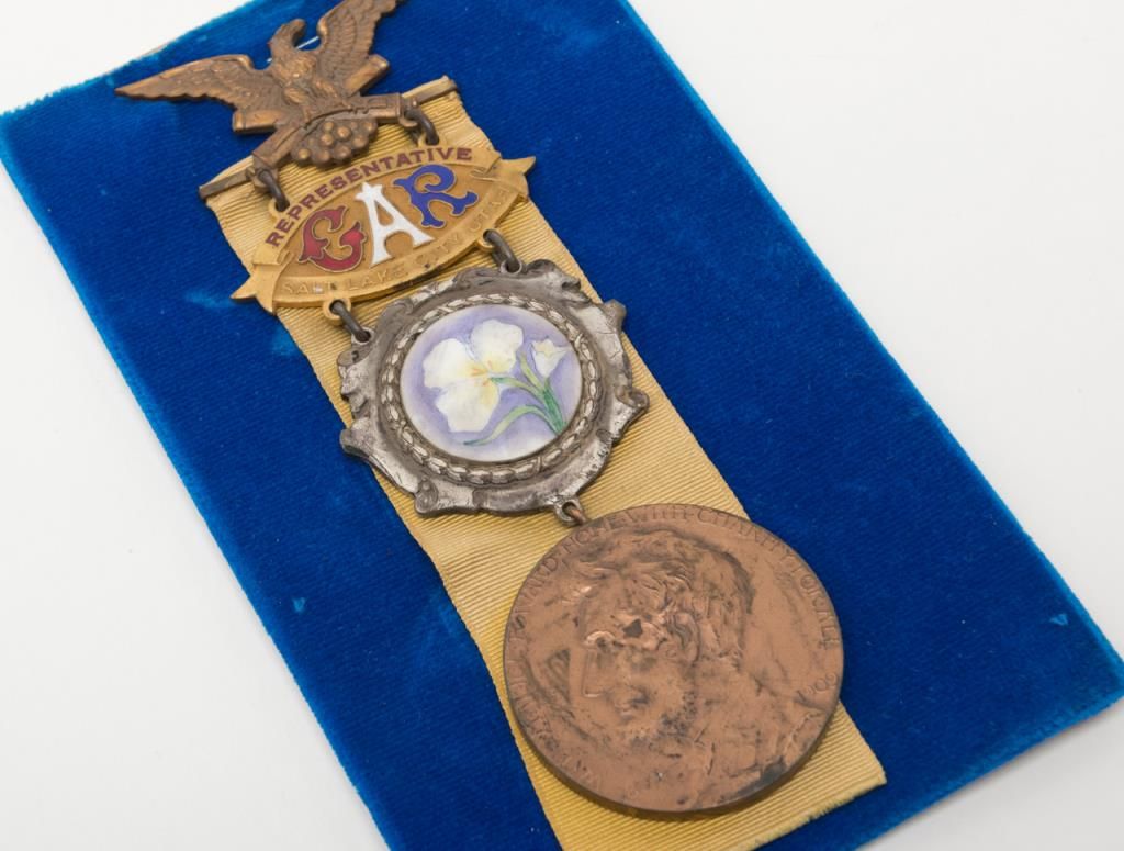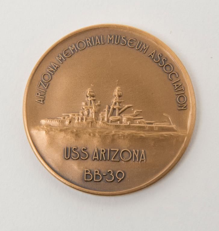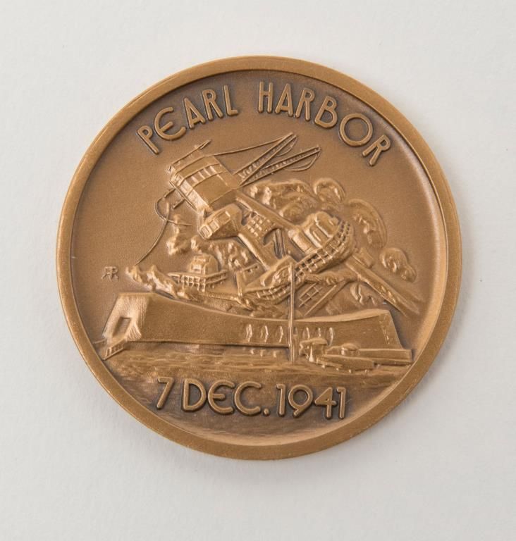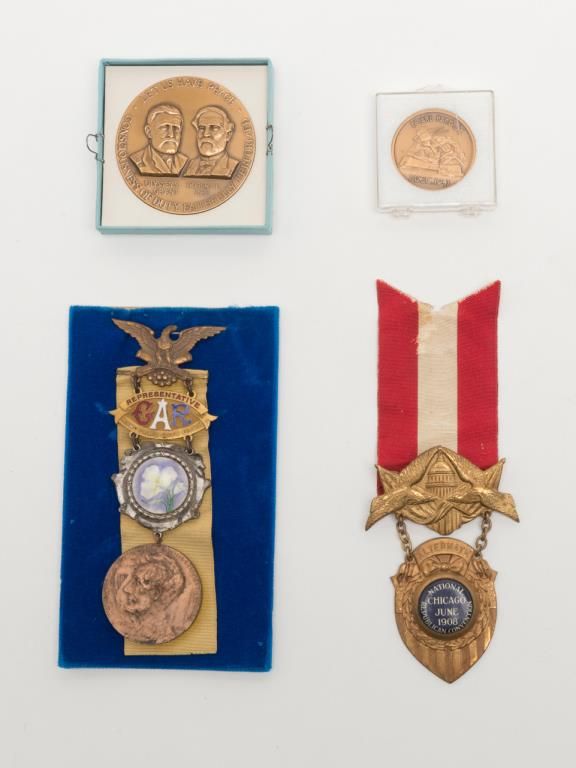 Lot of 4 items as described. Item number 1 is a die struck bronze medallion of Pearl Harbor, December 7, 1941 showing U.S.S. Arizona and issued by the Arizona Memorial Museum Association in the original holder. Number 2 is a G.A.R. Civil Warveteran’s representative badge from Salt Lake 1909 reunion in good condition with yellow ribbon. Number 3 is a Republican National Convention alternatives I.D. badge from Chicago in 1908 with eagle hanger and ribbon in very good condition.Number 4 is a 1965 Centennial commission issued official Civil War medallion showing Grant and Lee struck by the Medallic Art Co. New York in original box in mint condition. Est.: $200-$400