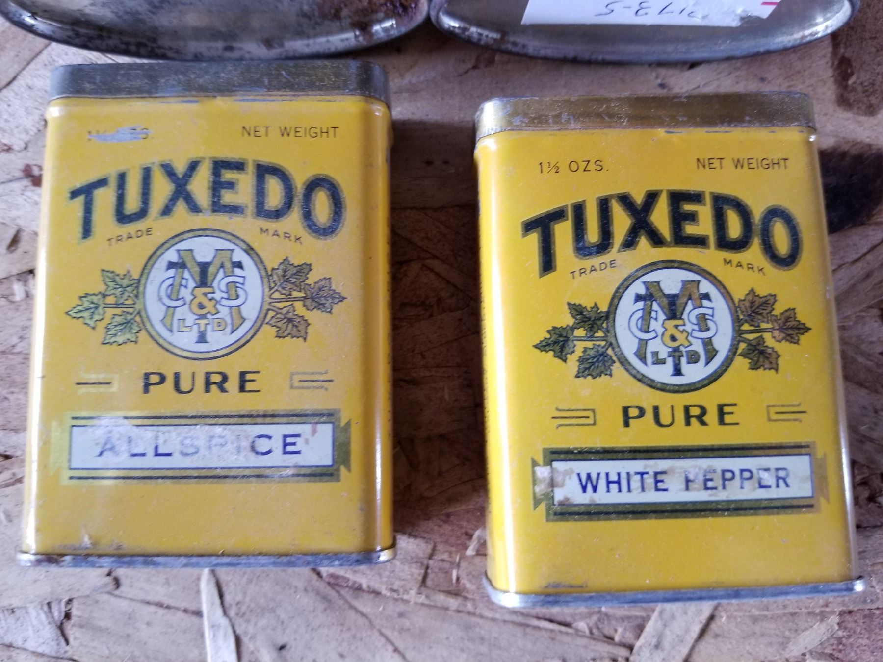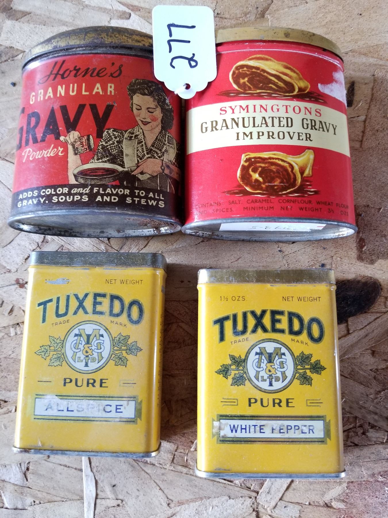 Lot of 4 kitchen tins, 2 tuxedo spice, 2 gravy
