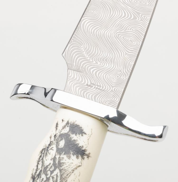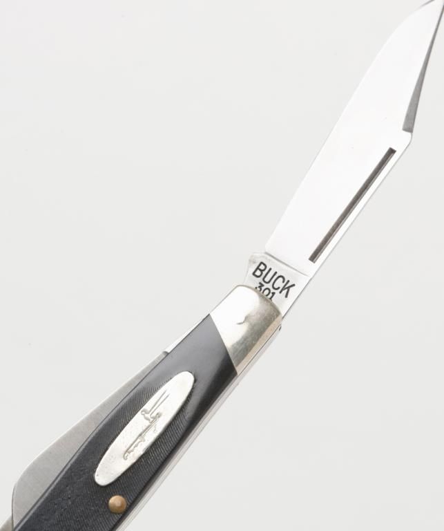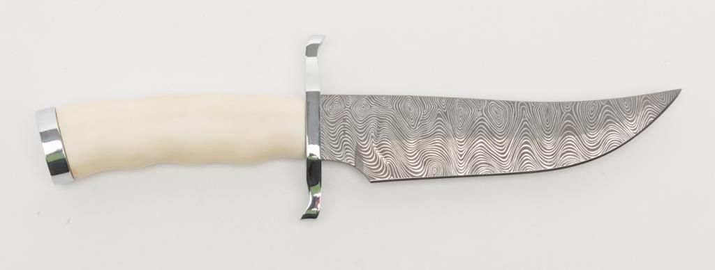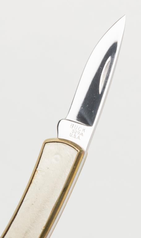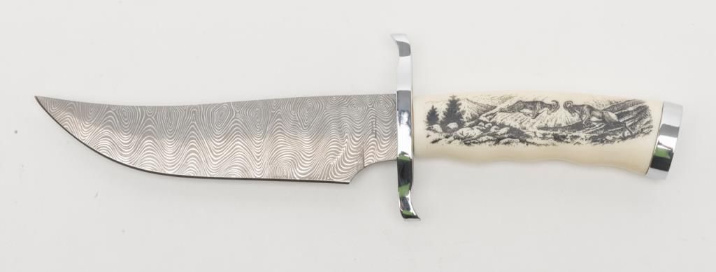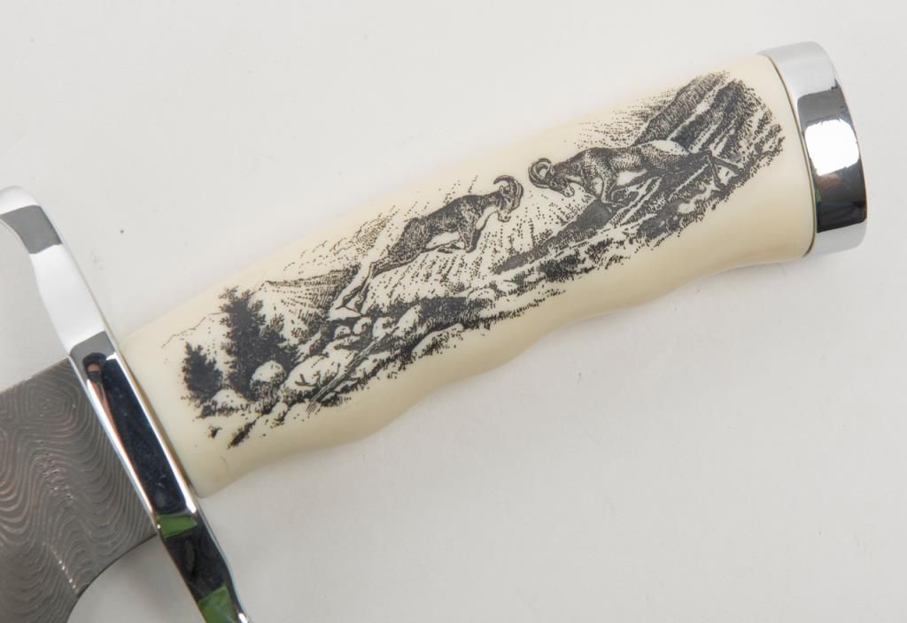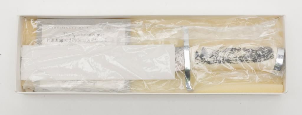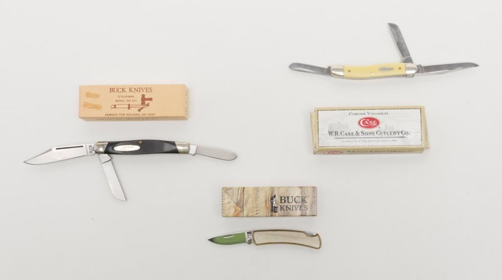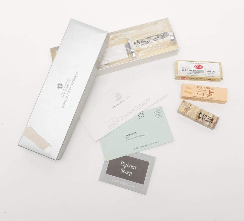 Lot of 4 knives. Number 1 is a sportsman’s year commemorative knife by Franklin Mint in original box showing simulated Damascus blade and simulated scrimshaw grip with scene of battling Rams mint in box. Along with 3 pocketknives in originalboxes. Number 2 is a buck model 301 3” blade folder mint in box. Number 3 is a W.R. Case and Sons 3” blade folder with yellow composite scales marked “Stockman” mint in box and Buck Buckskin model 529E1 mint in box with original instructionwrapper. Est.: $250-$500