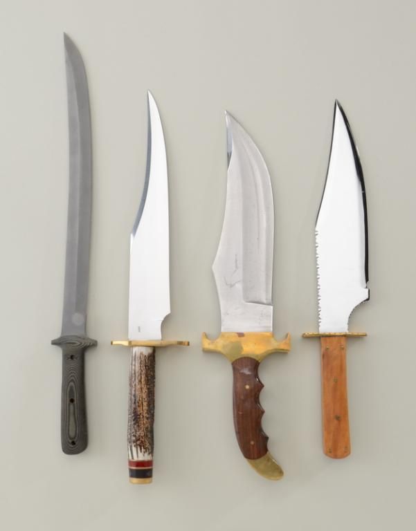 Lot of 4 large modern custom knives including an unmarked clip point bowie in like new condition approx. 17” overall with an approx. 11” blade with wood grip; a thin long blade knife by G. Hicks of Yucaipa, CA in finecondition with leather sheath, approx. 20” overall with an approx. 15” blade; a massive approx. 4 pound bowie by Rigid, numbered 0975 with brass mountings and hardwood grips, approx. 17” overall with an approx. 11” blade with Rigid heavy leather sheath in fine condition and a long clip point big modern bowie by Stek with stag grip and heavy leather sheath in like new condition, approx. 18” overall with an approx. 12” blade.Est.: $700-$1,400.