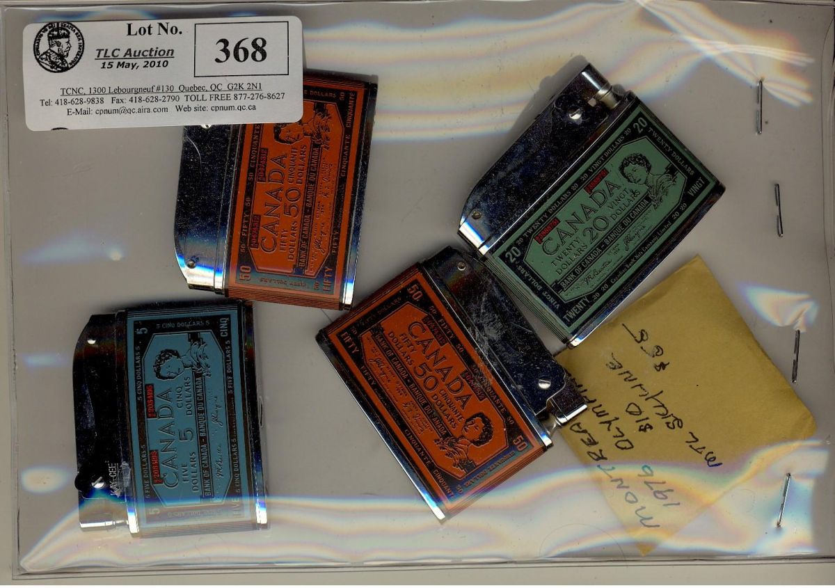 Lot of 4 lighters showing Canadian banknotes, 1954 $5, $20, $50 (2), also includes a 1973 Olympic $1