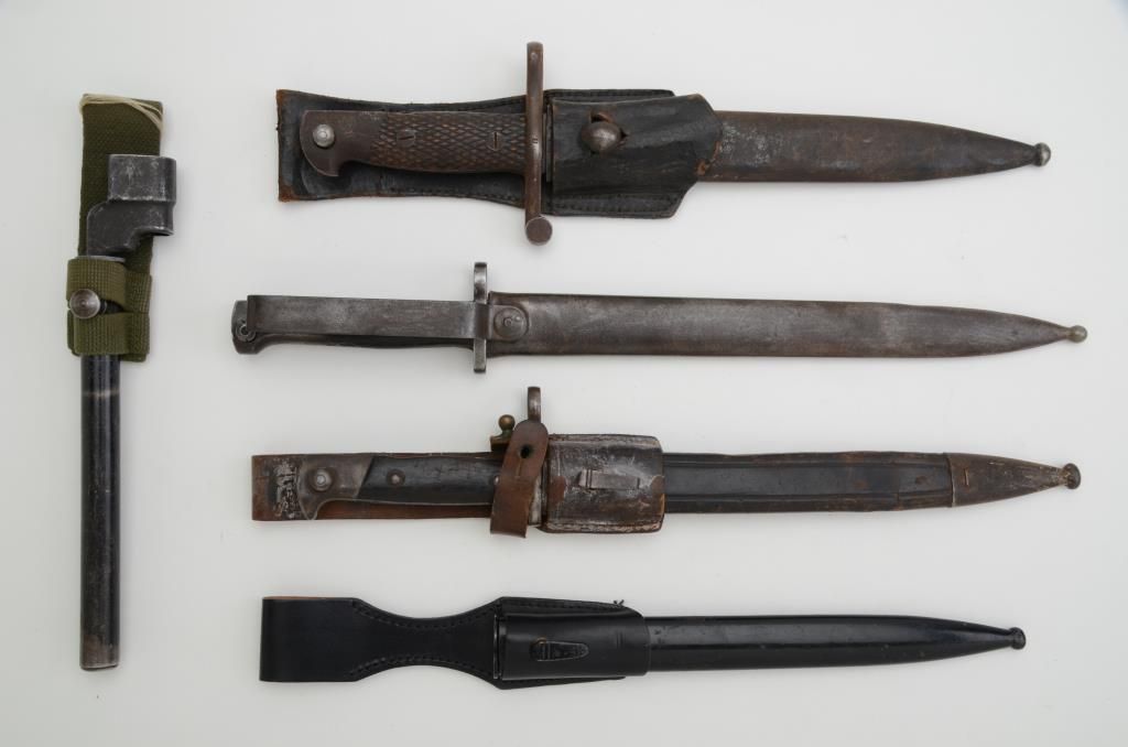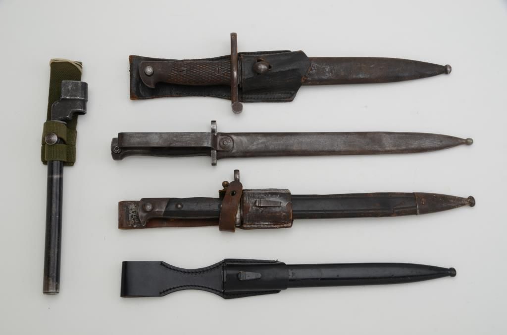 Lot of 4 misc. bayonets and a metal scabbard with leather hanger including one British bayonet with metal scabbard and woven hanger, one European bayonet with metal scabbard and two European bayonets, one with a metalscabbard, one with a leather scabbard and both with leather hangers. Est.: $125-$225.