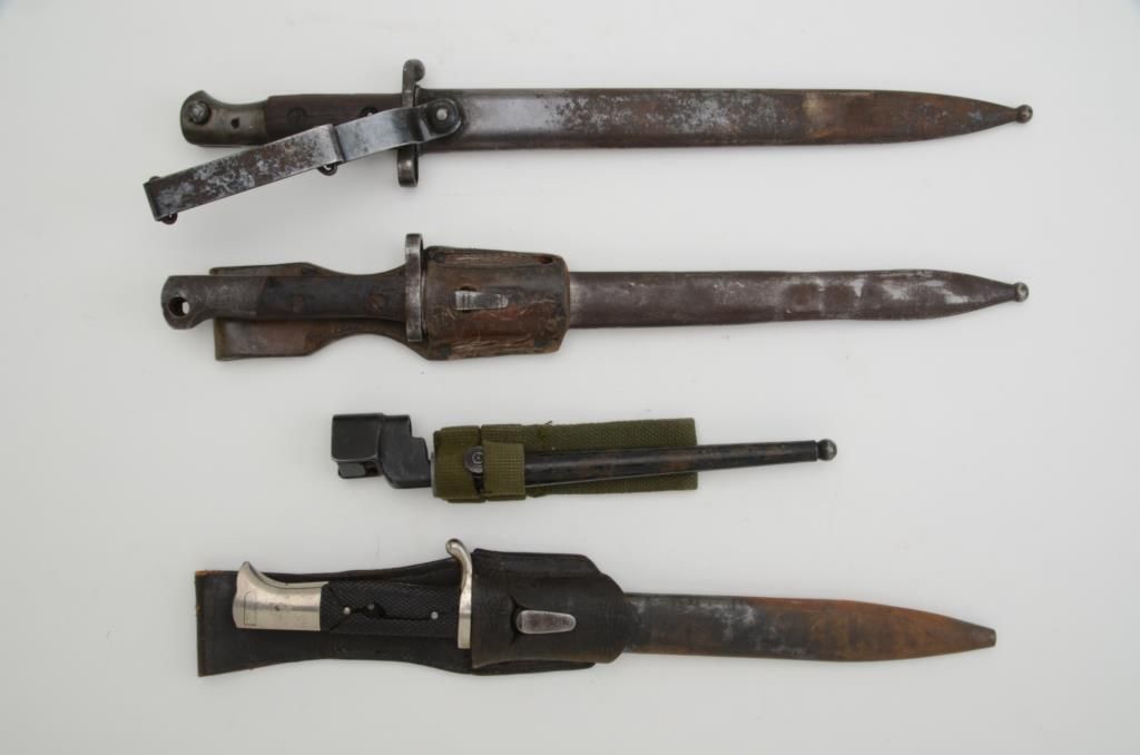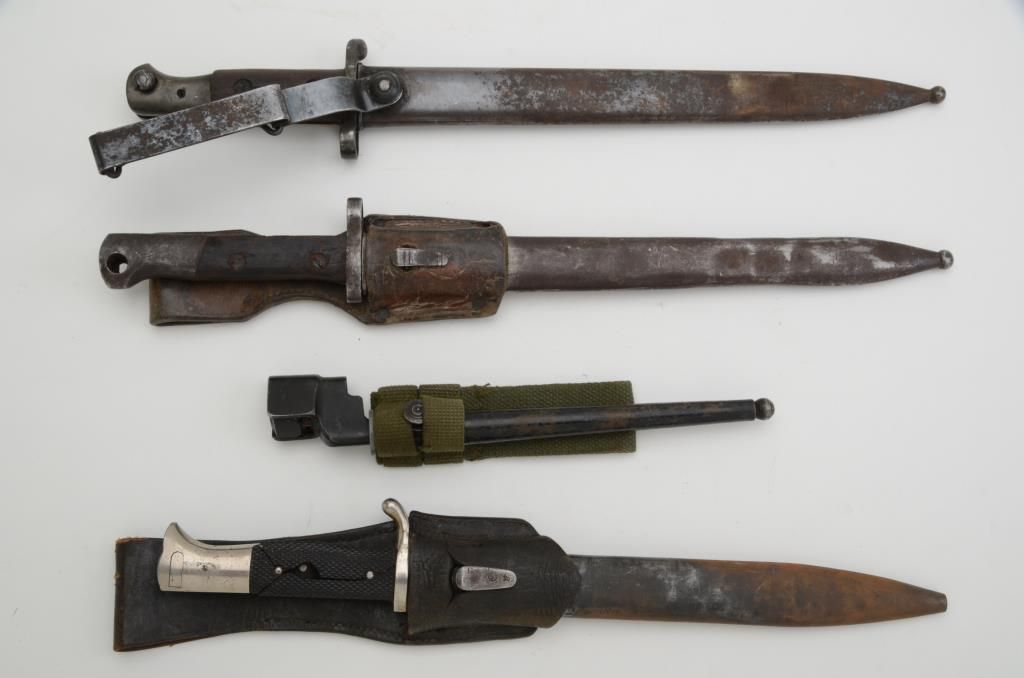Lot of 4 misc. bayonets including 2 British and 2 German, all with sheaths, one German with broken grip; all in well-used condition. Est.: $100-$175.