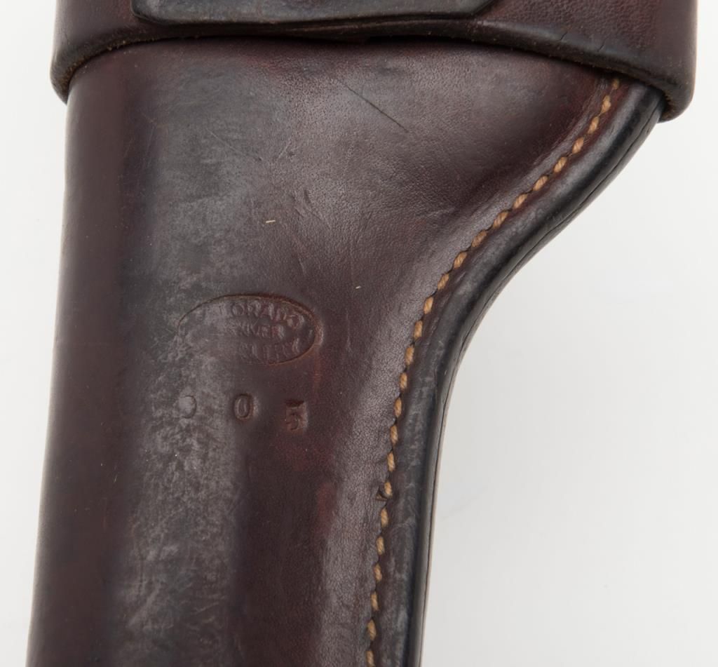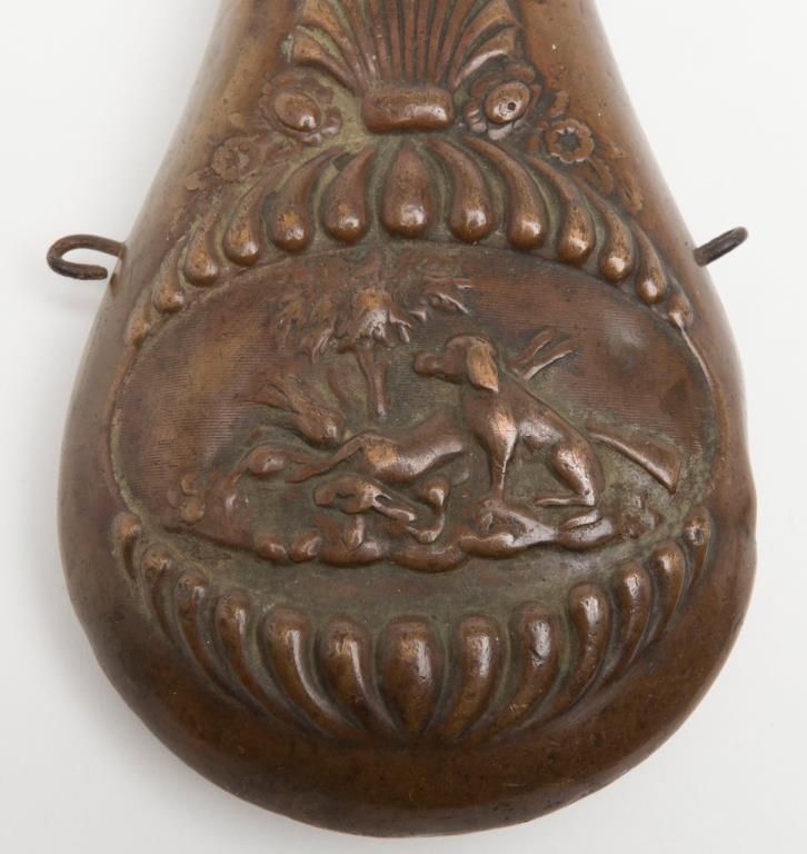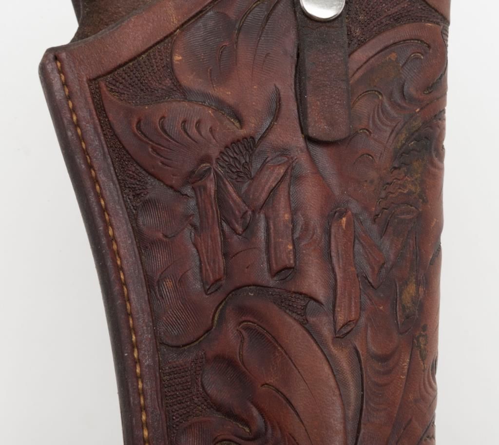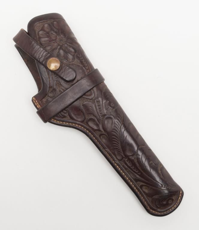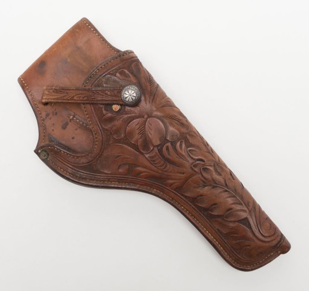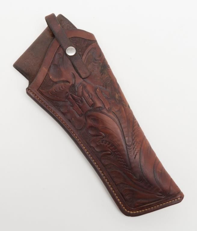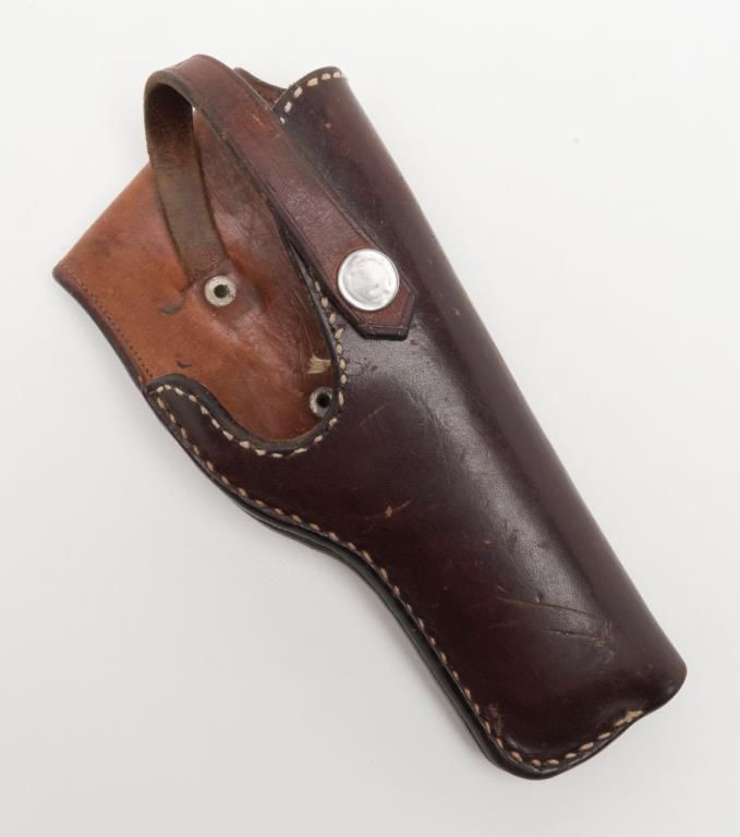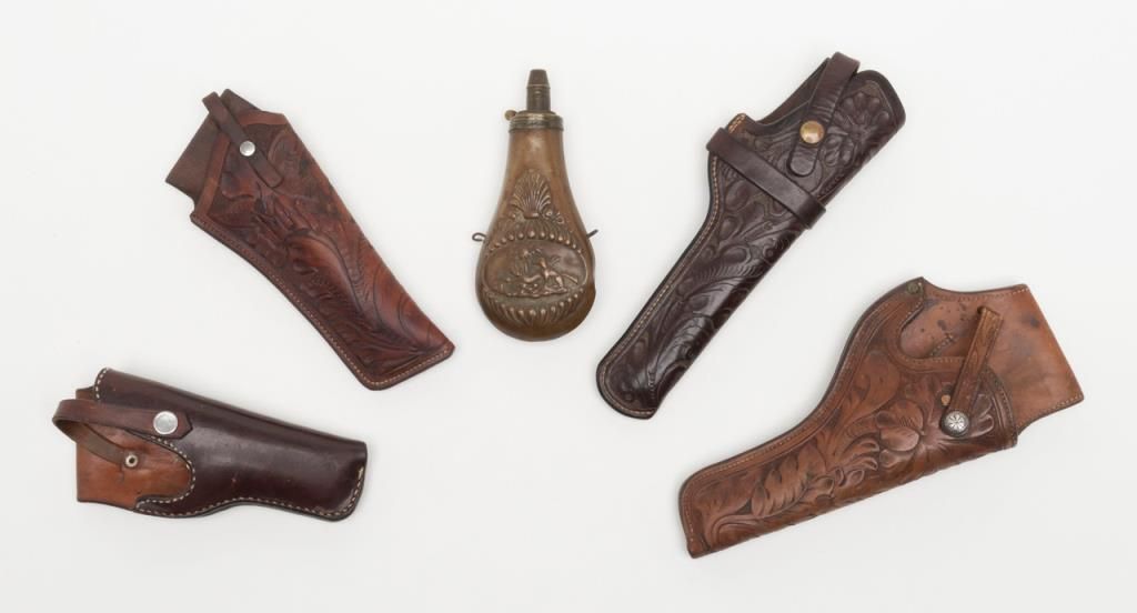 Lot of 4 misc. leather holsters and a brass powder flask. Est.: $80-$160.