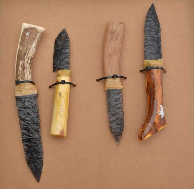 Lot of 4 modern-made hand chipped stone knives, three with wood grips, one with stag grip; ranging in overall size from approx. 11” to 8”; nicely accomplished and attached to grips with sinew wrapping; great fordisplay. Est.: $200-$300.