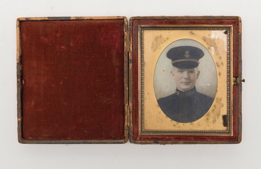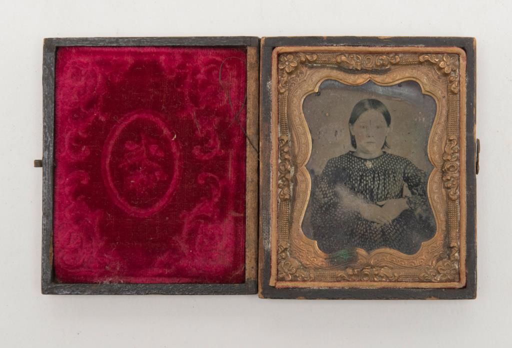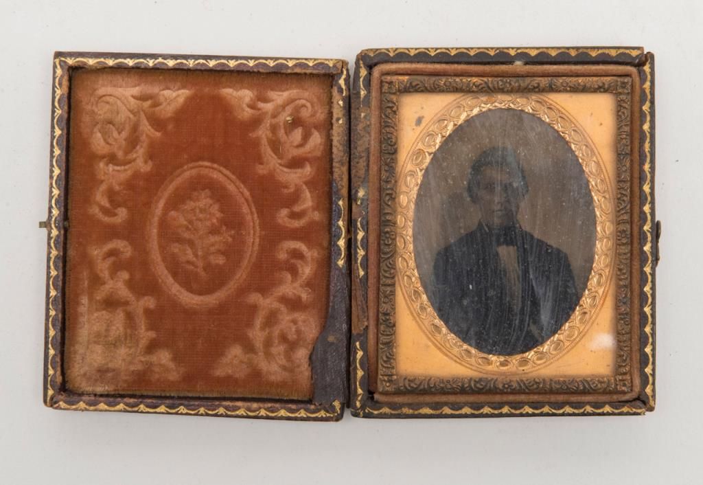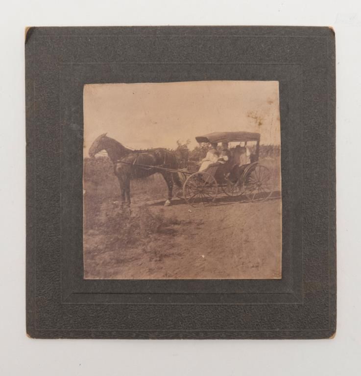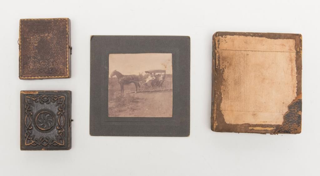 Lot of 4 old photos including a small cabinet photo of a family in horse drawn buggy; a uniformed soldier in hardcase; a small ambrotype in case of a gentleman and a small ambrotype of a little girl in case. Est.: $75-$125.