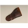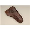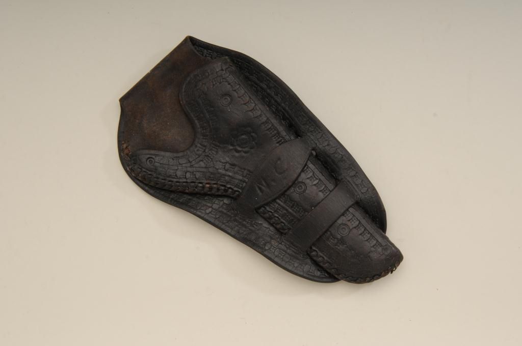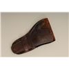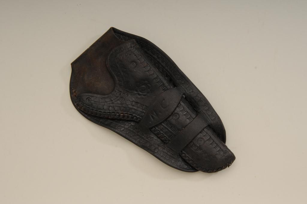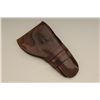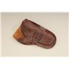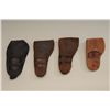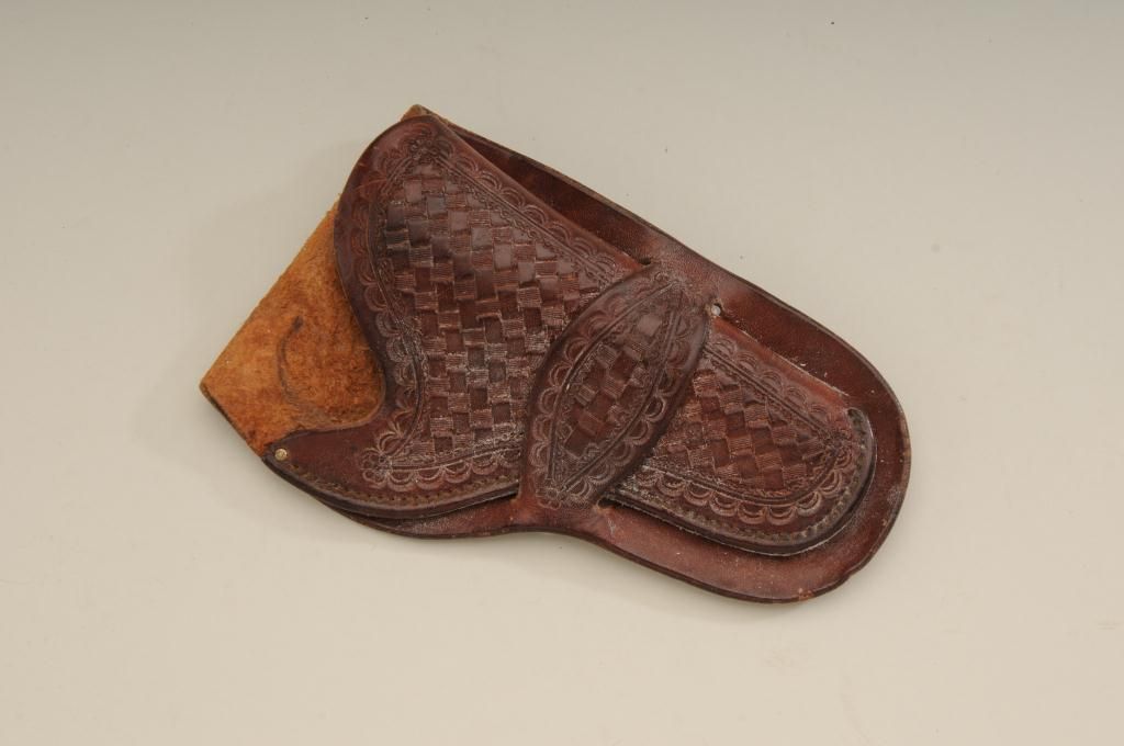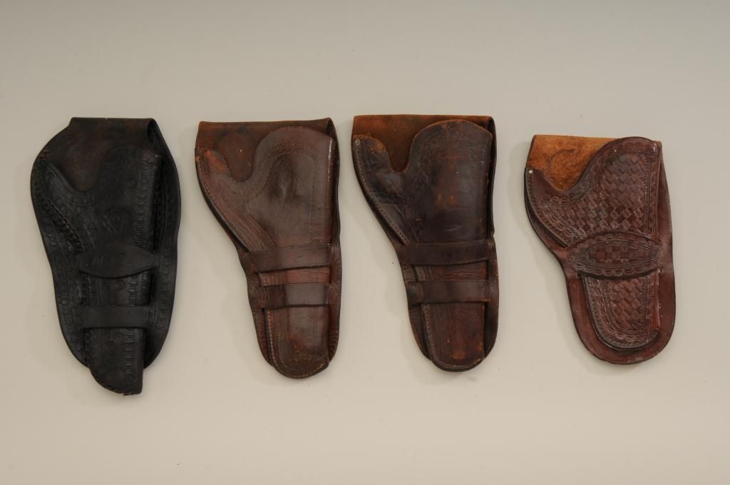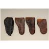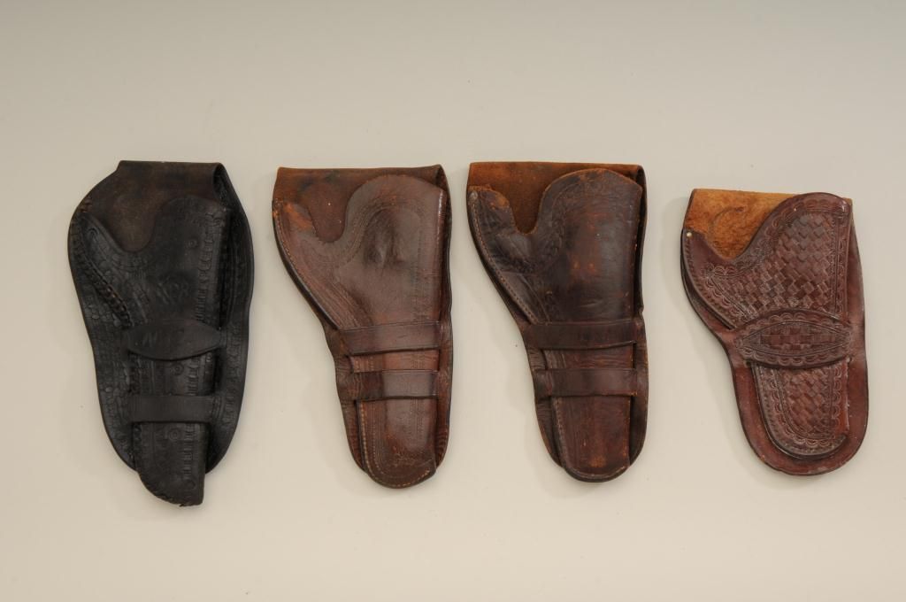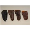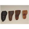 Lot of 4 older medium frame revolver leather holsters, none maker marked including a basket weave single loop in good condition; a double loop with border tooling in fair to near good condition; another double loop with border tooling in good condition and a double loop, tooled and stitched with “N.C.” initials carved on top loop in fair to near good condition. Est.: $400-$800.