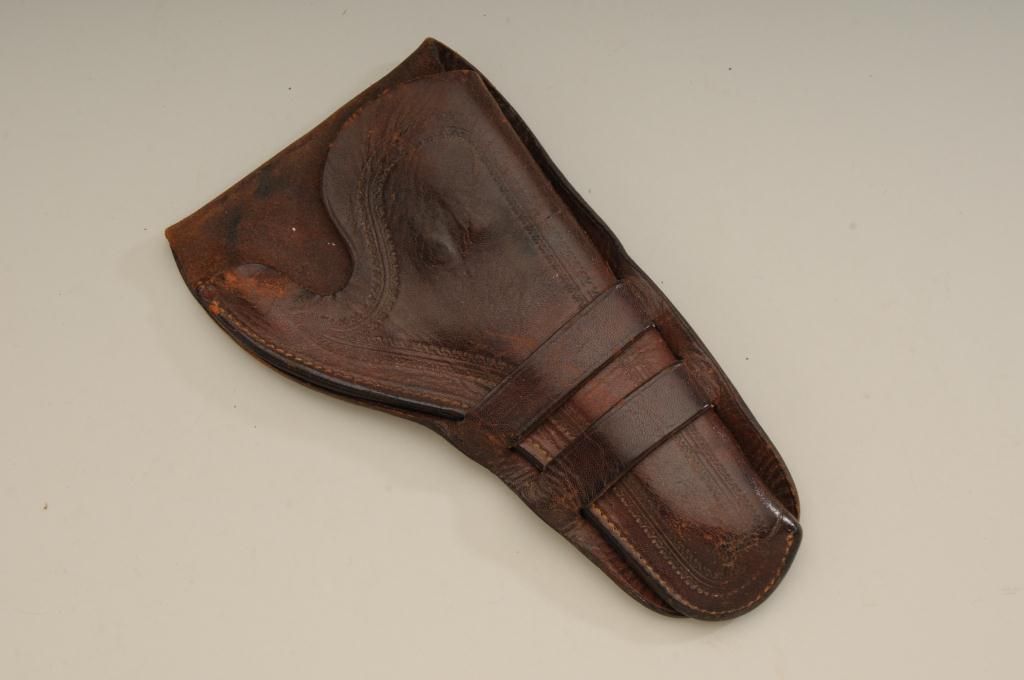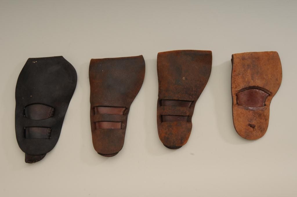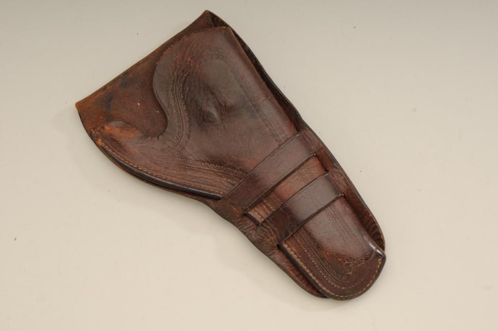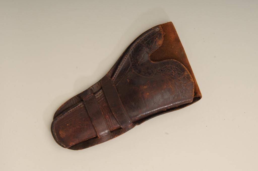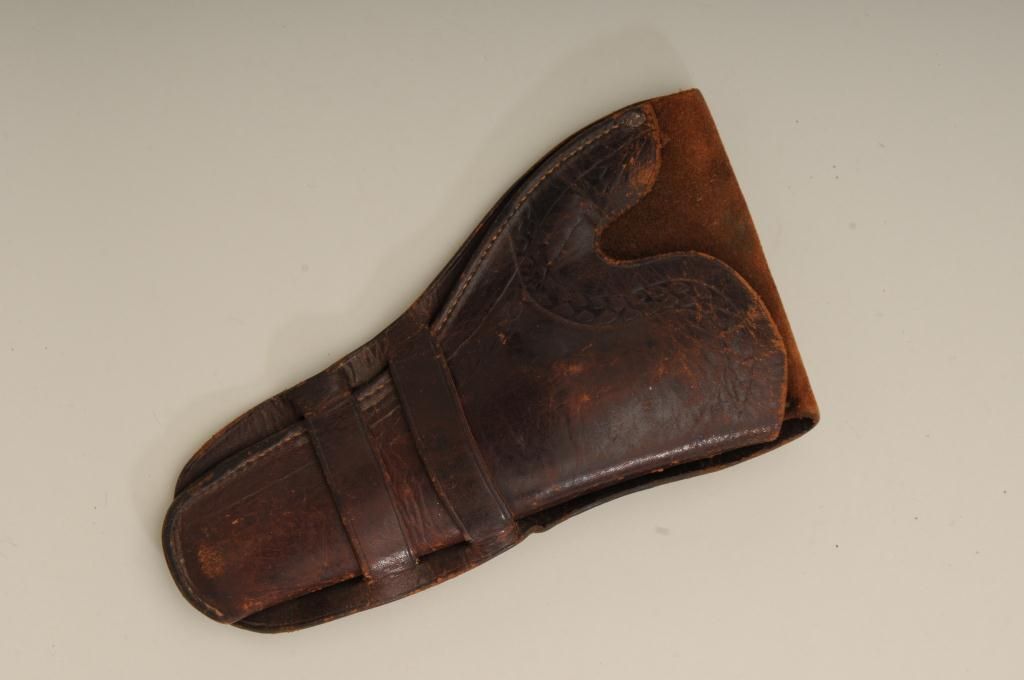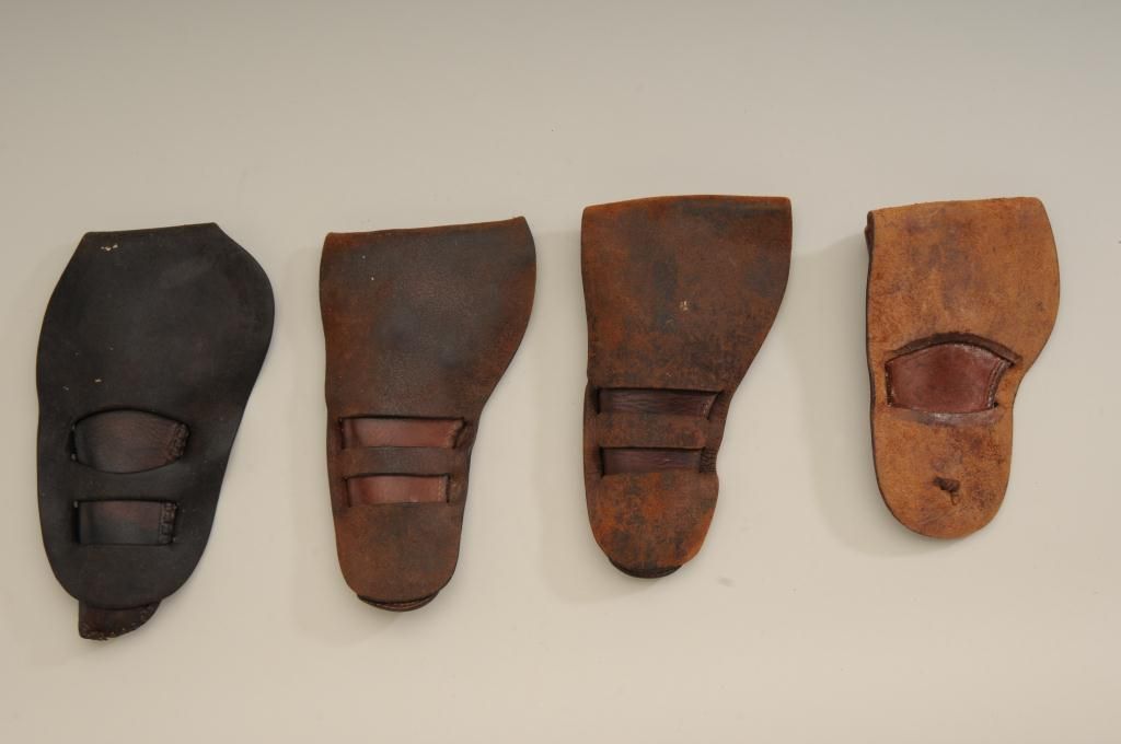 Lot of 4 older medium frame revolver leather holsters, none maker marked including a basket weave single loop in good condition; a double loop with border tooling in fair to near good condition; another double loop with border tooling in good condition and a double loop, tooled and stitched with “N.C.” initials carved on top loop in fair to near good condition. Est.: $400-$800.