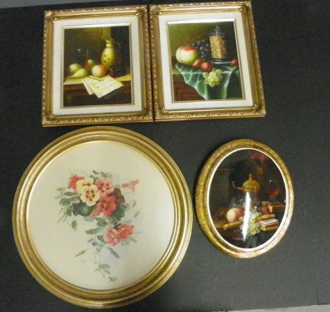Includes: pair "Still Life" paintings on canvas, oval "Still Life" on board & print of "Flowers". Various sizes. From an estate located at 860 5th Ave. NYC. Please read our terms of sale.