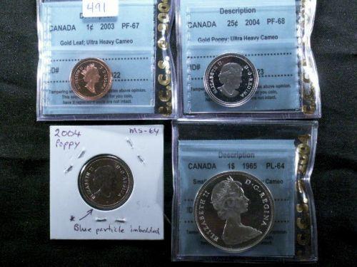 Lot of 4 pieces including a 2003 1¢ Gold leaf CCCS PF-67 Ultra Heavy Cameo, 2004 Silver gold poppy CCCS PF-68 Ultra heavy Cameo, 2004-P poppy mint error MS63 and a 1965 SB, Blunt CCCS PL-64 Heavy Cameo. Should be viewed! Sold as is, no return.