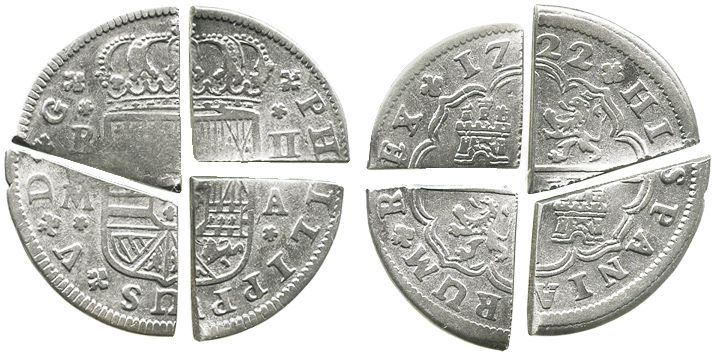 Lot of 4 quarter-cut "bits" of a single Spanish "pistareen" (Madrid 2R 1722A), found together in a colonial area in New Jersey as circulated in the colonial US. 5.7 grams. Metal-detectorists find these cuts all the time up north, but NEVER all 4 pieces of the SAME COIN! The cuts are clearly old, and somewhat irregular, but there is no way the cut pieces could have circulated and ended up together, so surely this was freshly cut when lost in the 1700s. VF overall.