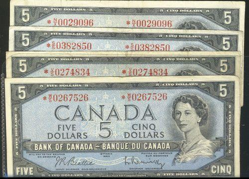 Lot of 4 replacement 1954 $5 notes BC-39bA including *N/X, V/S, S/S, W/S. Grades vary from F to VF.