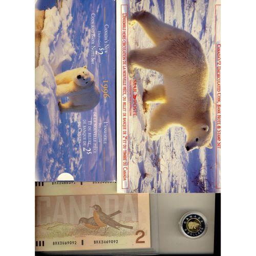 Lot of 4 sets of $2,00: 1996 Piedfort with 2 notes BRX uncut, Set $2 BRX + $2 Proof, Set $2 note + $2 coin Proof Like, And a set of $2 Canada Post with note + coin + stamp,