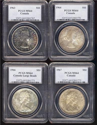Lot of 4 silver dollars, all PCGS MS64. Includes 1963, 1964, 1966LB, 1967. Some are nicely toned.