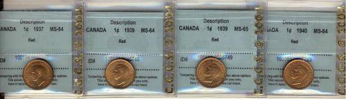 Lot of 4 small cent pieces, all CCCS certified, includes 1937 MS64, 1939 MS64 and MS65, 1940 MS64. All coins are red.