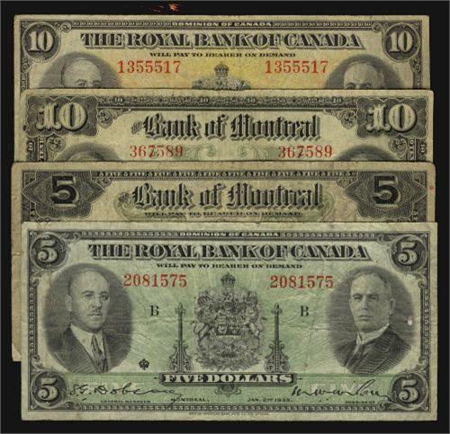 Lot of 4 small size chartered banknotes; Bank of Montreal 1938 $10, 1942 $5 scarce, Royal Bank 1935 $5 and $10 notes. Grades vary from VG to Fine.
