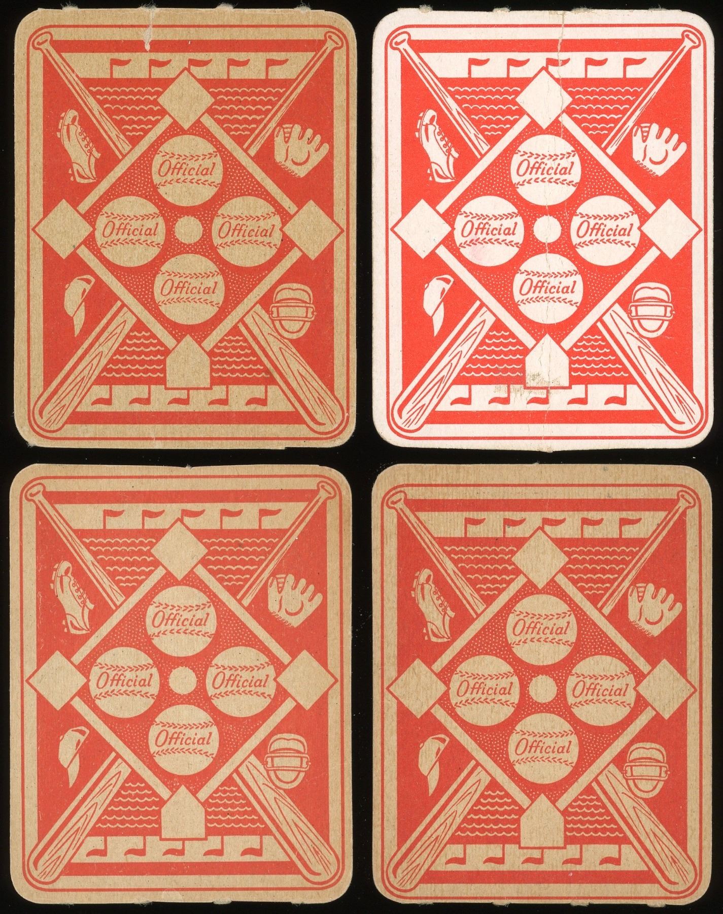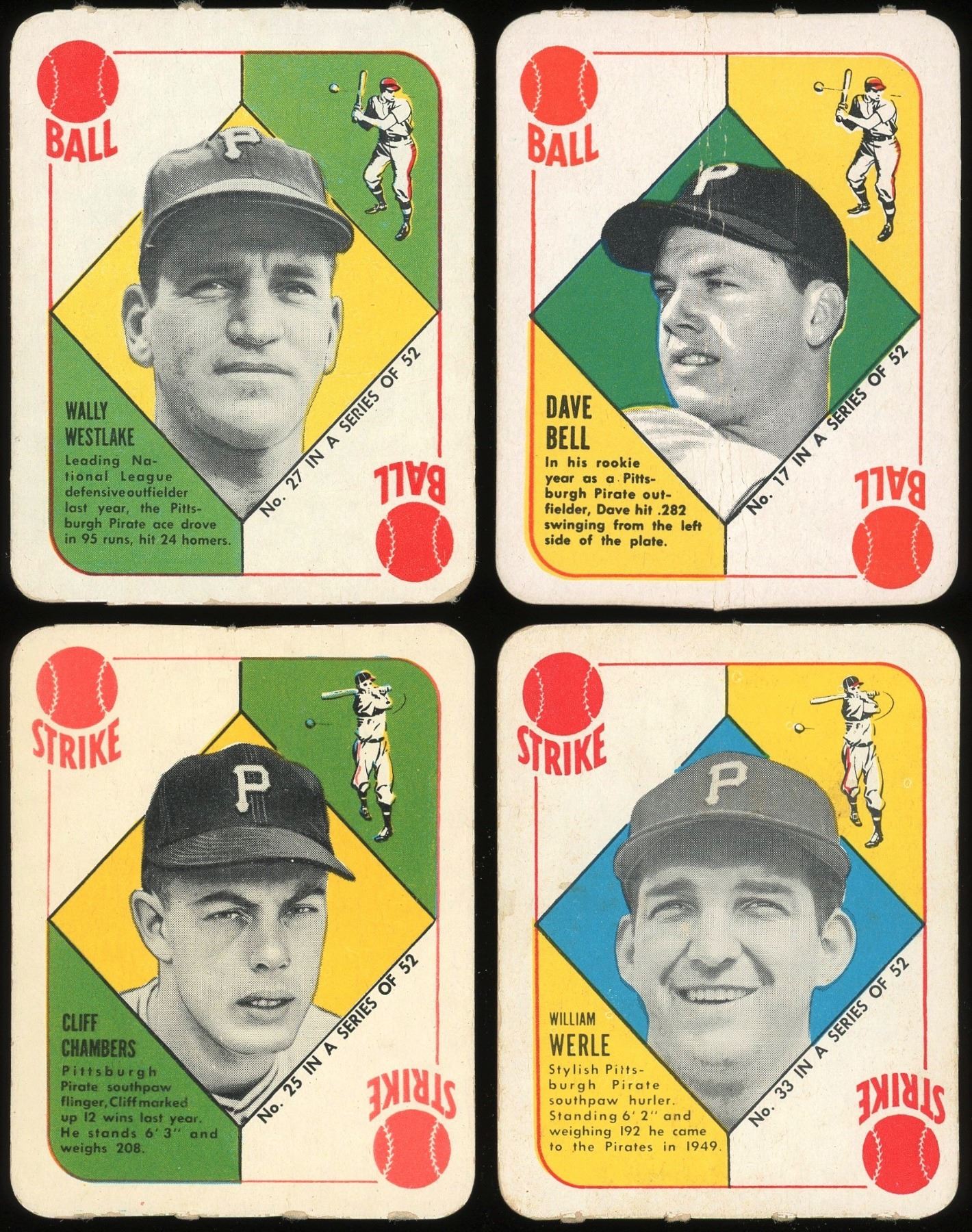 This lot consists of four cards from the 1951 Topps "red back" game cards. Prior to their groundbreaking 1952 set Topps issued a card game with both red and blue backs. Cards include #17 Gus Bell RC (FR-GD), #25 Cliff Chambers (VG-EX), #27 Wally Westlake (VG) and #33 Bill Werle (GD).