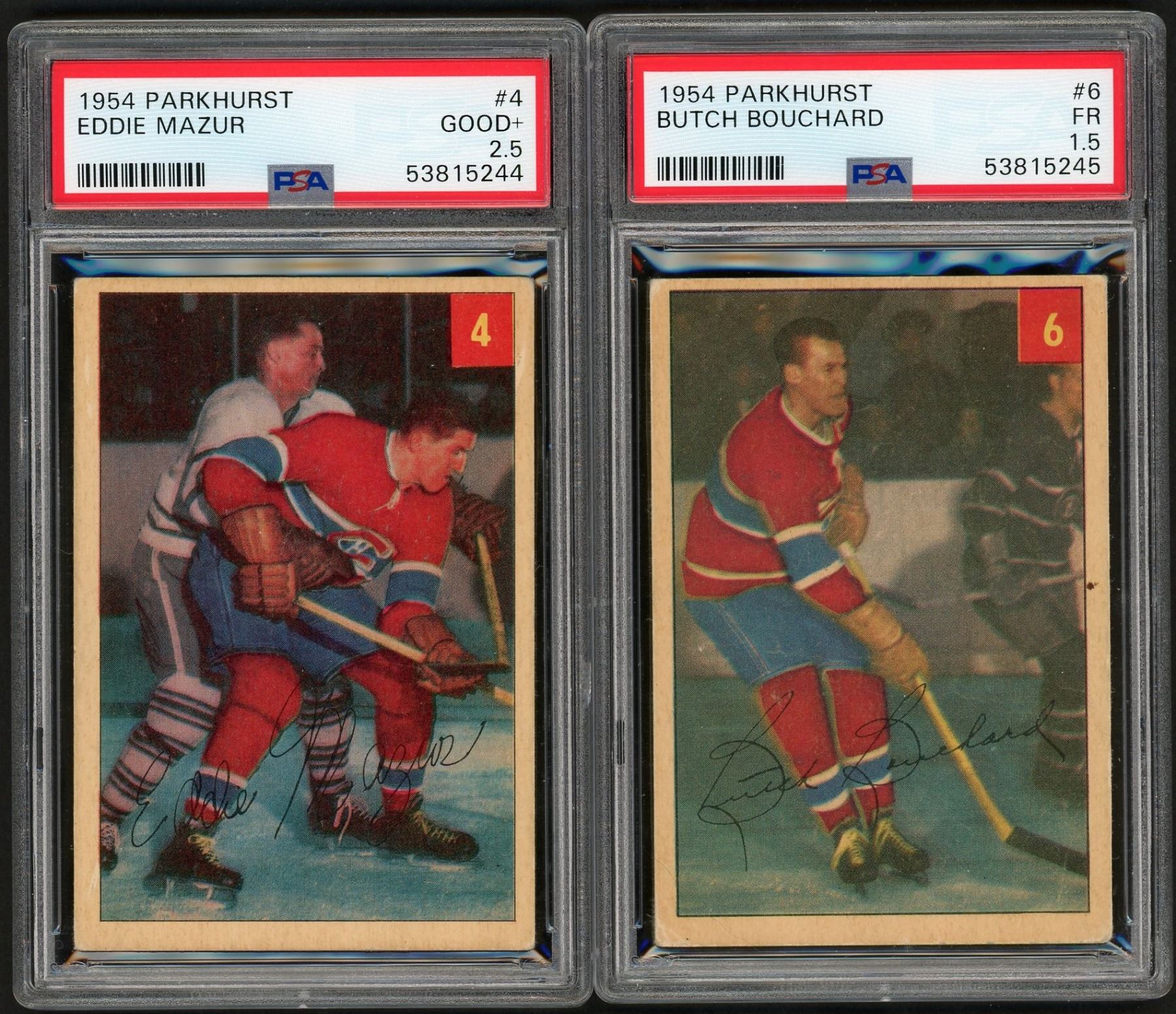 Lot contains 4 different PSA graded Montreal Canadiens cards from the 1954-55 Parkhurst set, includes #4 Eddie Mazur (GD+ 2.5), #6 Butch Bouchard (FR 1.5), #11 Calum MacKay (GD 2) and #15 Floyd Curry (VG 3).