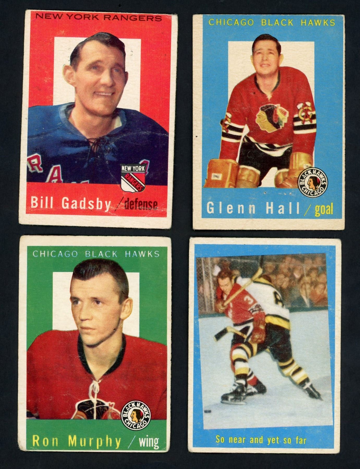 This lot consists of 4 star/HOFer cards from the 1959 Topps hockey set, includes #32 Glenn Hall (GD), #60 Pierre Pilote/Flem Mackell IA (VG), #62 Bill Gadsby (GD), #66 Ron Murphy (GD).