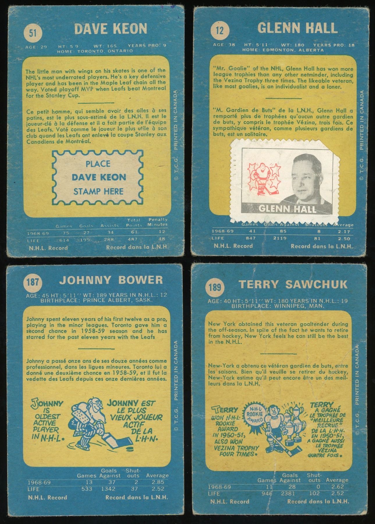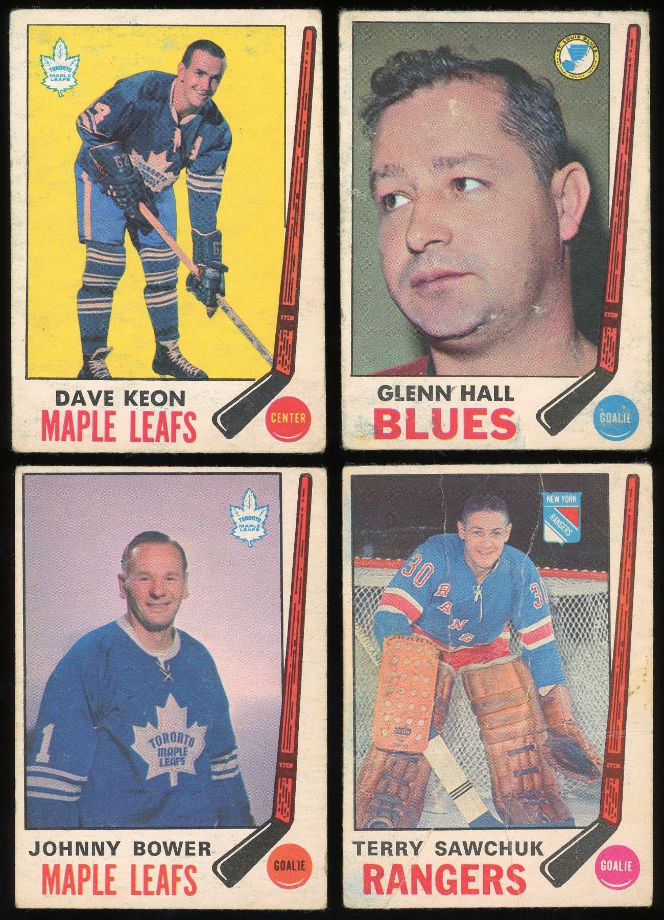 Off-grade lot includes four HOF cards from the 1969-70 OPC set, FR to VG (see scans), includes: #12 Glenn Hall, #51 Dave Keon, #187 Johnny Bower, and #189 Terry Sawchuk.
