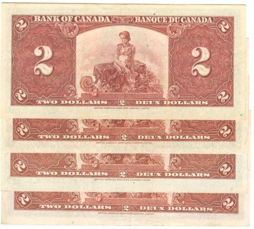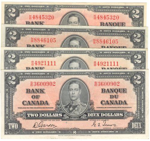 Bank of Canada Lot of 4 x $2.00 note 1937 in Extra-Fine, BC-22b Gordon Towers.