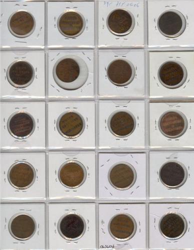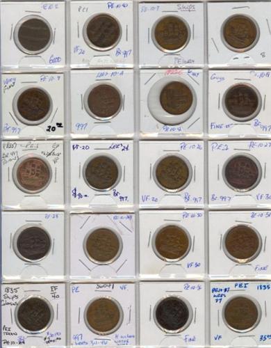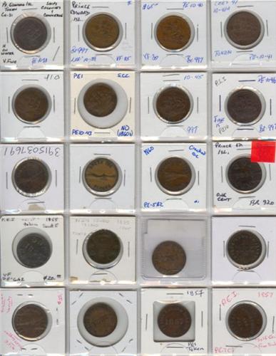 Breton Pre-confederation Tokens. Nice assortment of PEI tokens, ideal lot for research, unpicked and as received from our consigner. VG to EF average VF. Lot of 40 tokens.