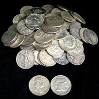 A lot with 40 mixed type-Kennedy-Franklin-Walker- 90% halves. Unchecked Various dates and grades.