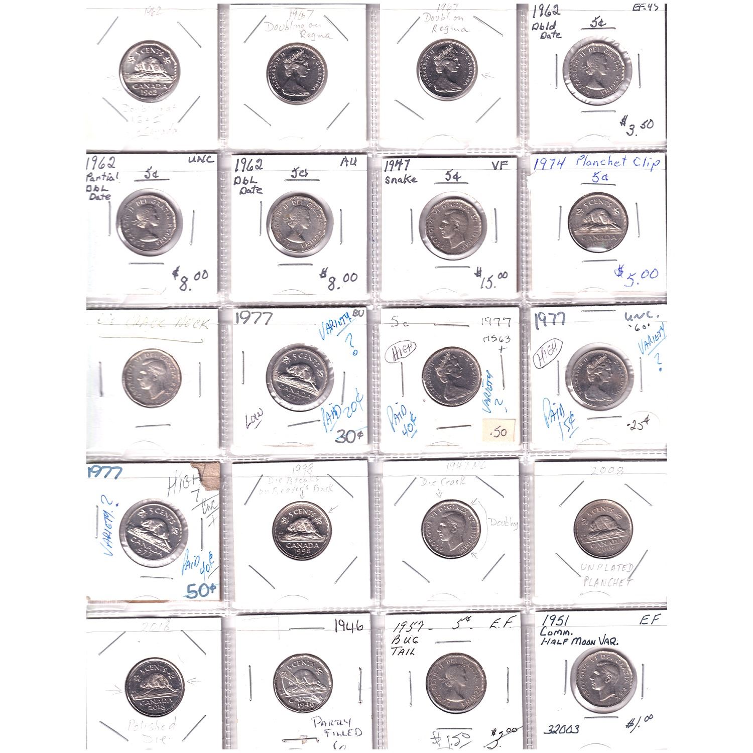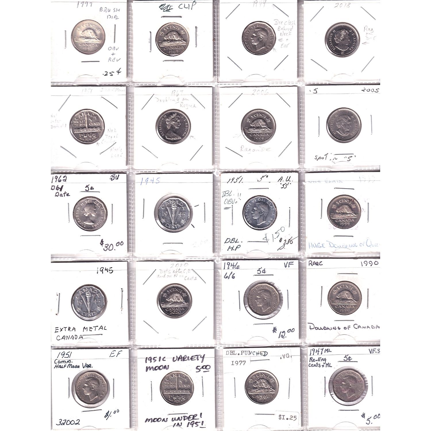 Lot of 40x 1945-2018 Canada 5-cent Coins. Many Errors Included! Lot Includes: 1946 6/6 VF, 1962 Double Date AU, 1977 Double Punched VG, & Many More!! Please view images for details and quality. 40pcs.
