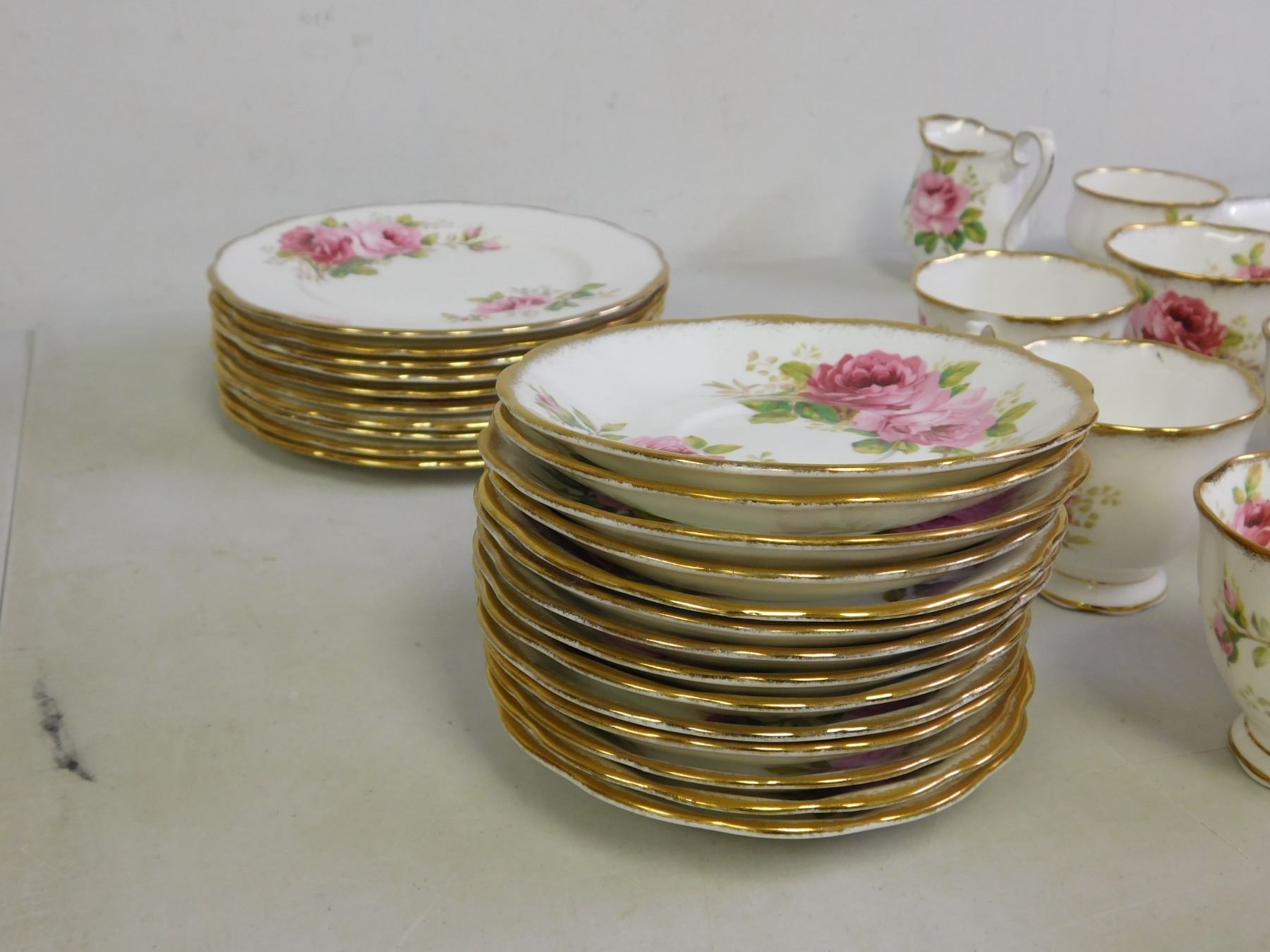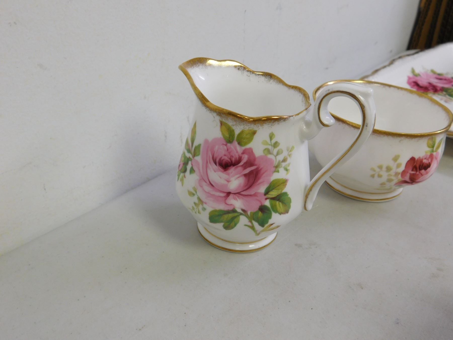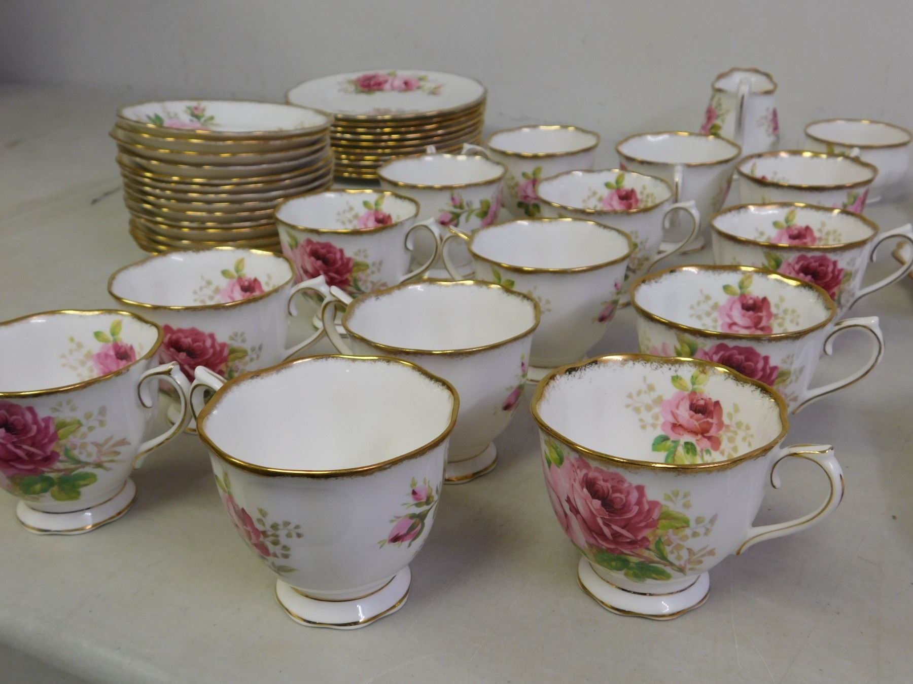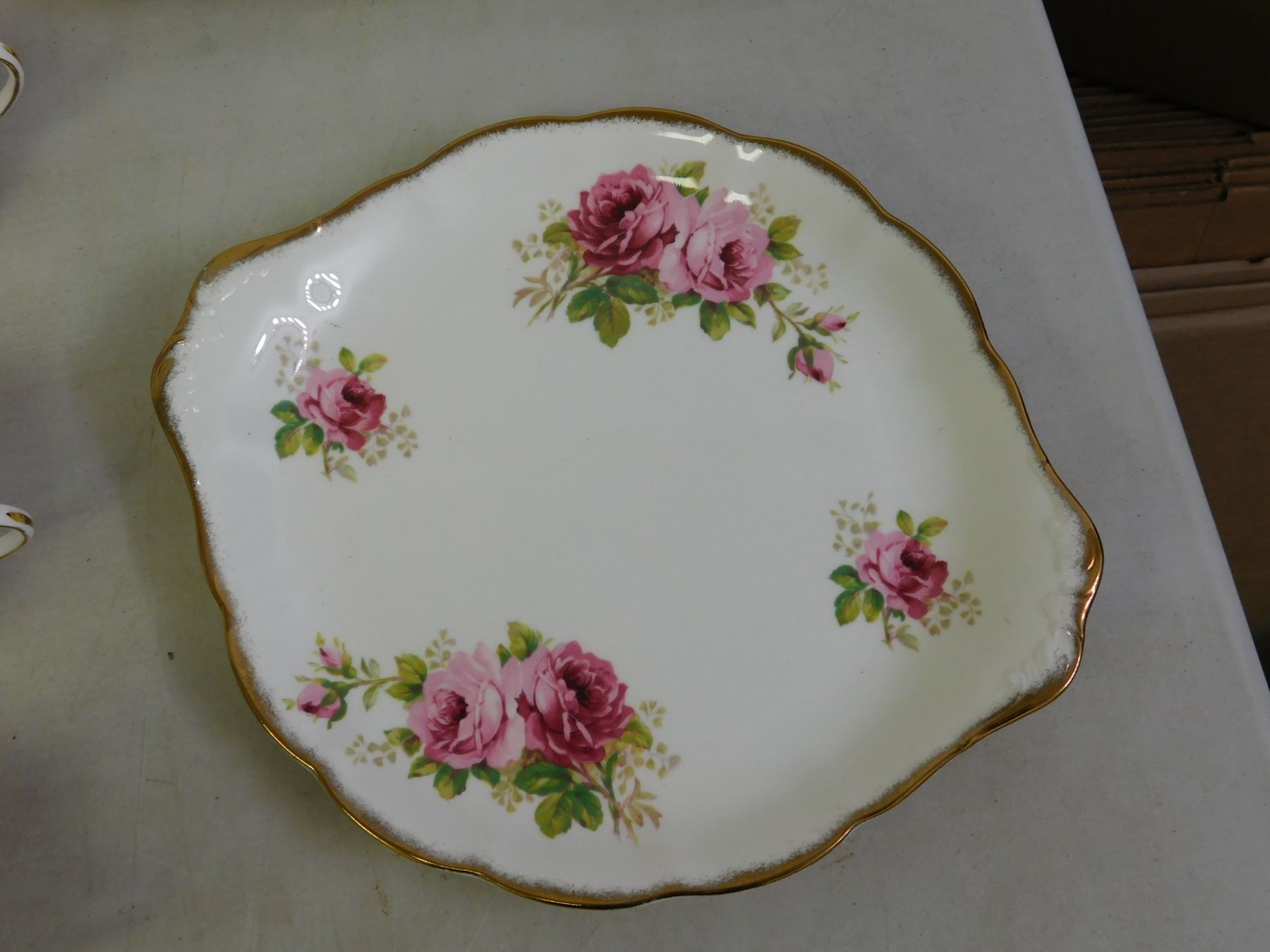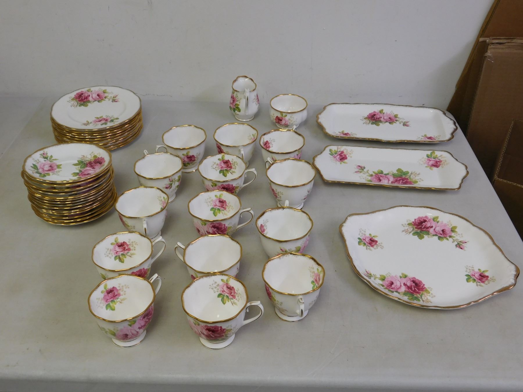 14 cups 14 saucers and 10 luncheon plates. set of cream sugar and 3 serving trays. all appears to be in nice condition
