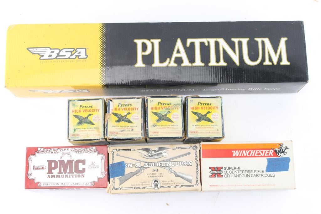 Includes: 44-40 (150 rds) Winchester, PMC, Ten-X, .410 (100 Shells) Peters, BSA Platinum 8-32x44mm Scope***Counts Are Approximate (+/-)***