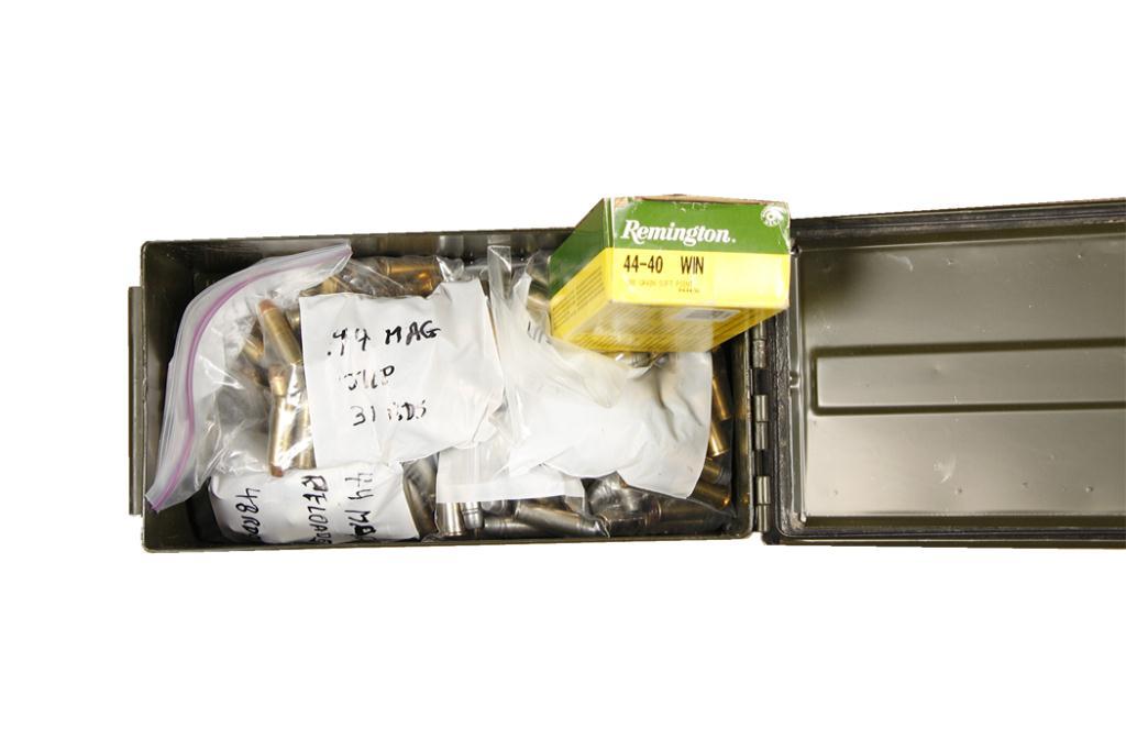 1 pkg,Consists of : 6 pkgs, 50 rds ea .44mag reloads with cast bullets 1 box, Remington .44mag 240gr lead bullets 1/2 gone 1 pkg, Win reloads .44 S&W Spec cast bullets,about 50 1 pkg, PMC reloads .44mag cast bullets 20 rds 1 pkg, PMC reloads .44mag JHP bullets, 31 rds 1 box, Rem reloads and empty brass .44-40, 9 rds In green military ammo can.