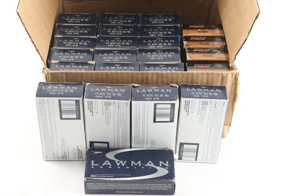 Approx. 1200 rounds of 45 ACP factory new ammunition. 1000 rounds of Speer 230 Gr. TMJ & 200 rounds of PMC 185 Gr. JHP. All in factory boxes.