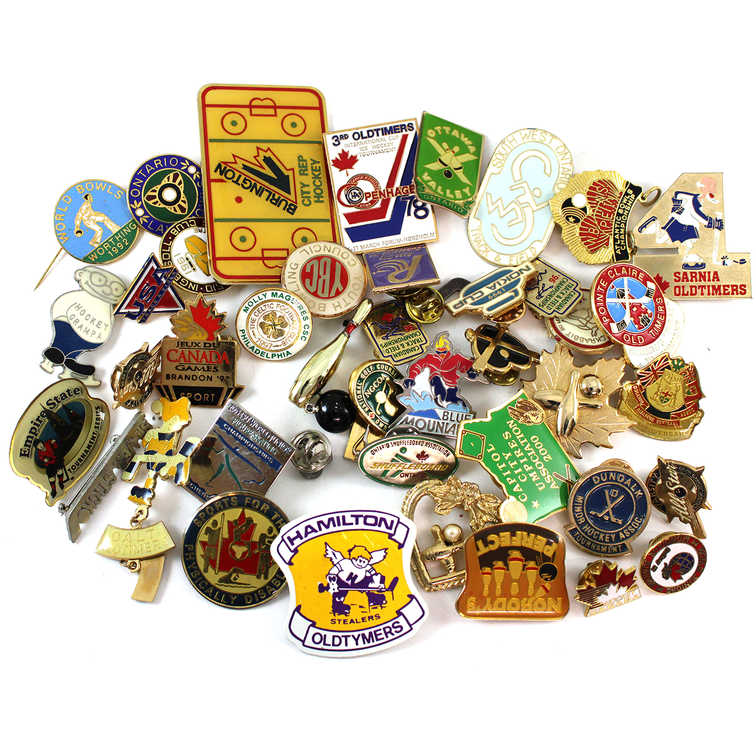 INCLUDES: Hockey Grampa, Southwest Ontario Track & Field, Ontario Lawn Bowls & many more!! Sold as is; please see images for details. 45pcs.