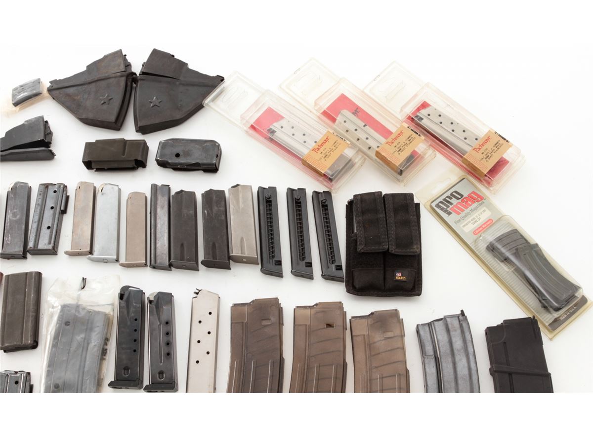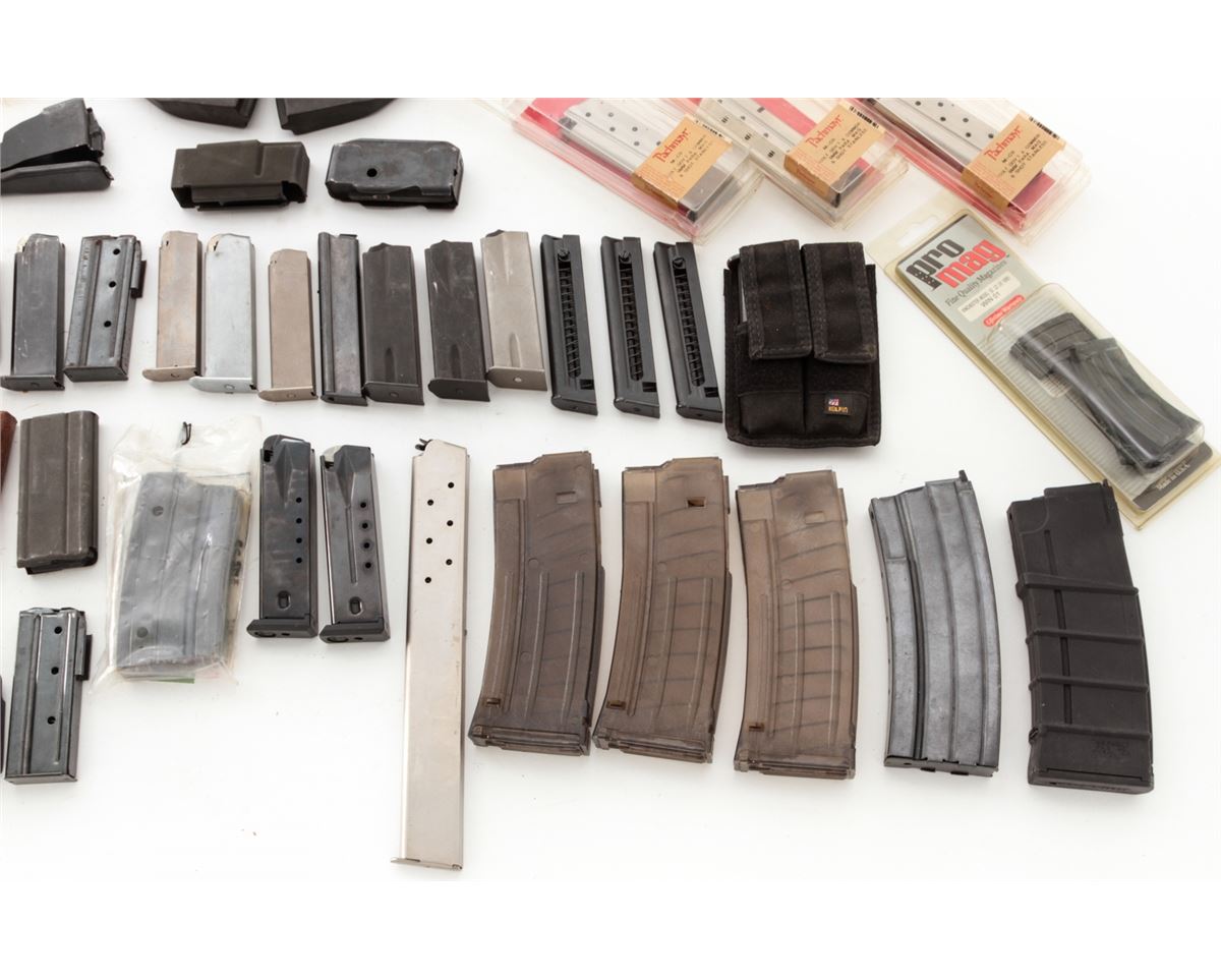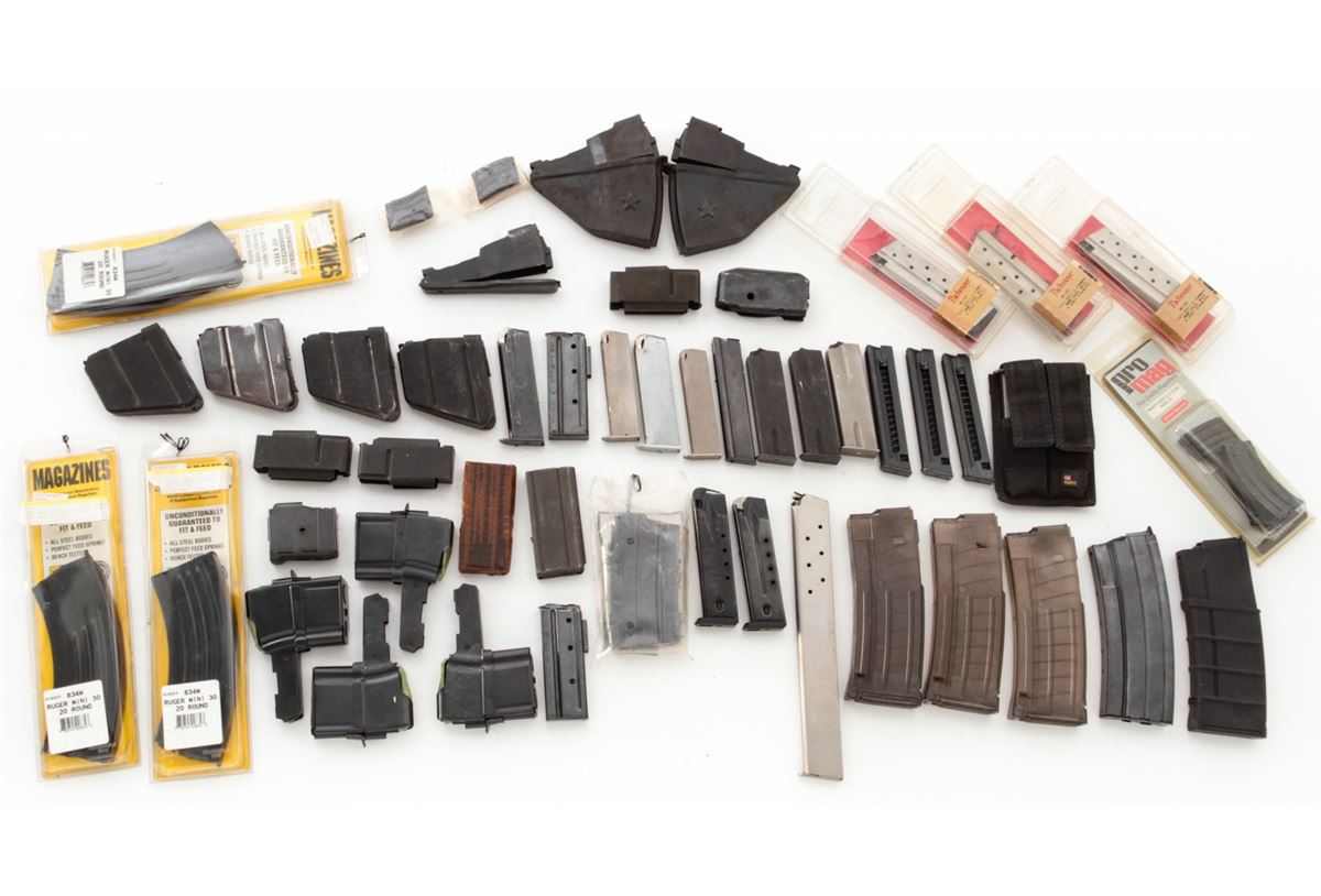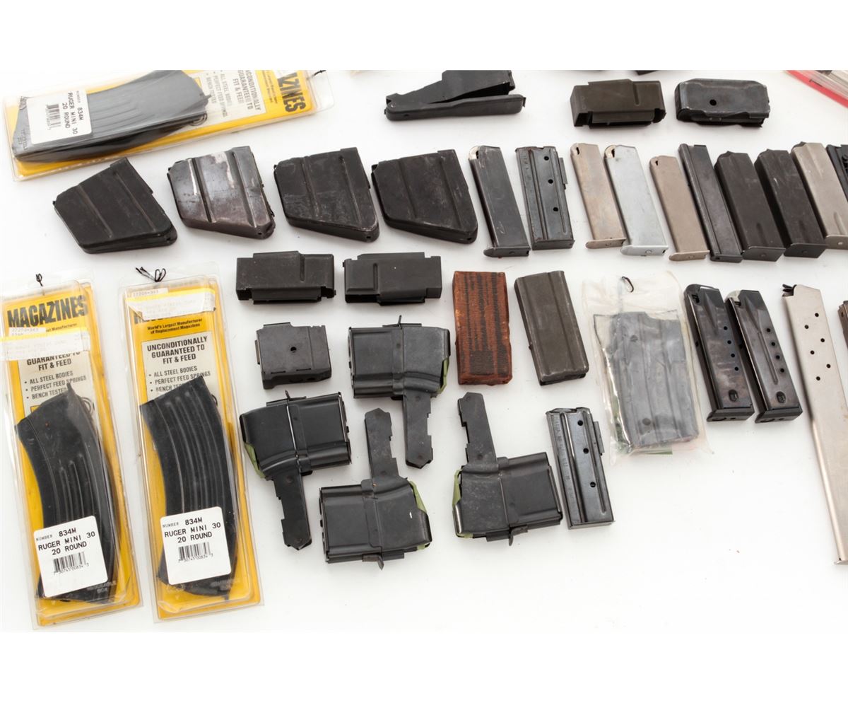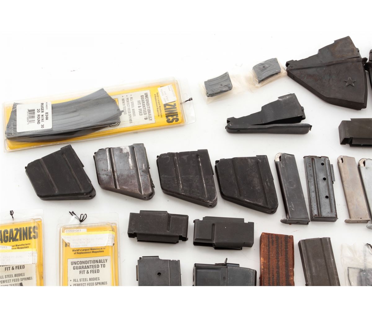 Lot of Approx. Forty-Eight (48) Rifle & Pistol Magazines, a few military but most are commercial, including eighteen (18) high capacity magazines, including magazines for 9mm Colt Gov't Model or Commander; Winchester Model 52; 30 round magazines for Colt AR-15 or Mini 14; Browning BAR .308/.243; Browning made Model 52 magazines with original box; 20-round magazines for a Ruger Mini-30; four (4) Lee Enfield magazines, and many others. Conditions range from very good to excellent. Several are in the original packing and appear as new. Est.: $400-$600/lot. (High cap mags not available to Calif. residents.)