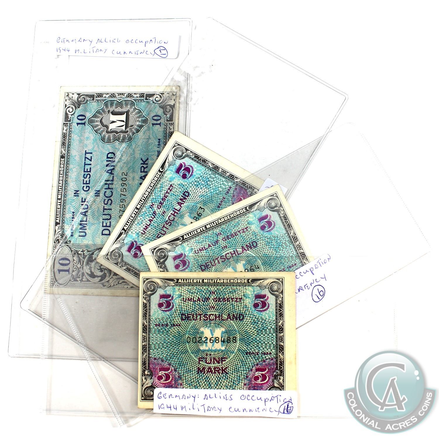 Lot of 4x 1944 Germany Allied Occupation Military Notes - 3x 5 Mark & 1x 10 Mark. 4pcs