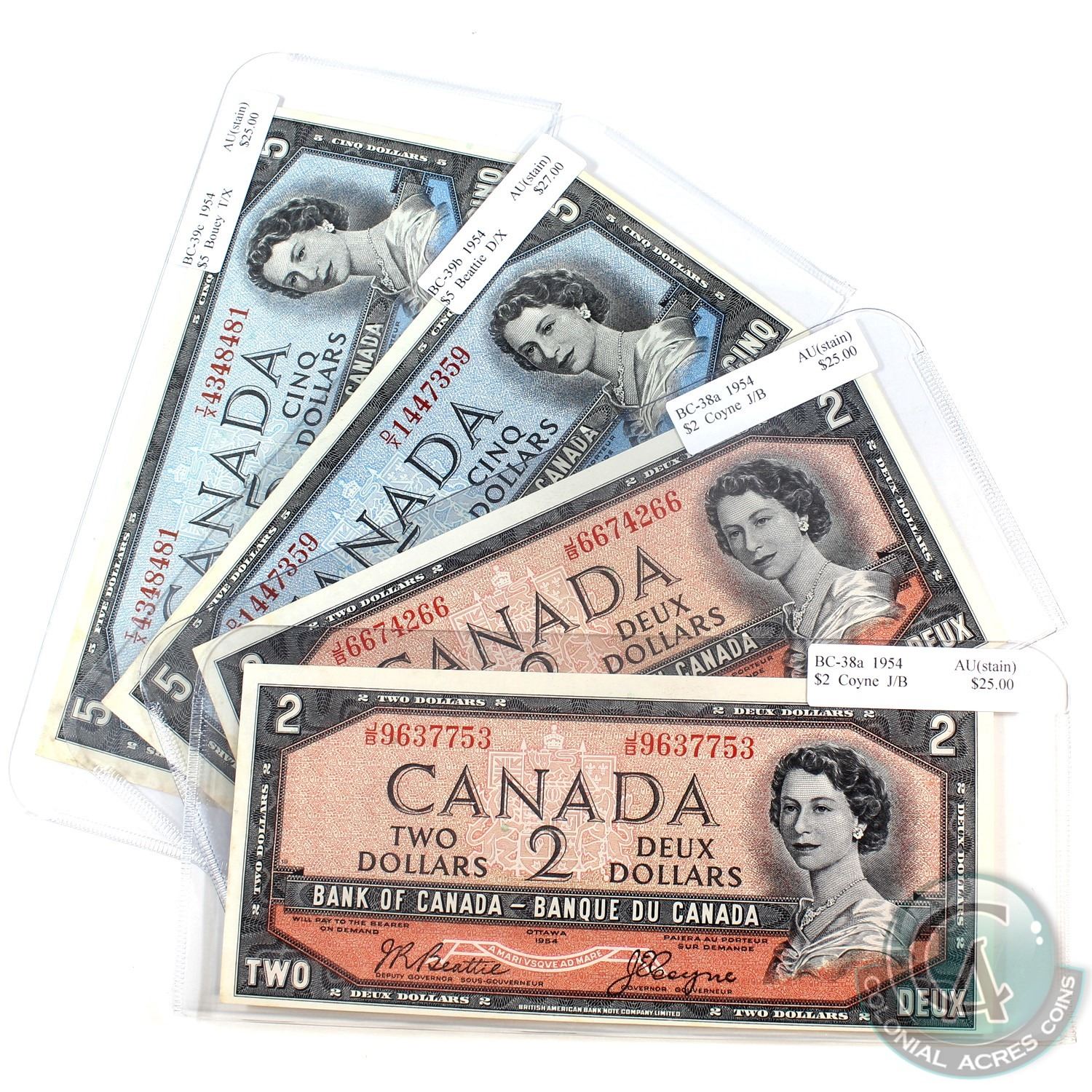 Lot of 4x 1954 $2 & $5 Bank of Canada Modified Portrait Notes in AU Condition (with stains) - 2x $2 BC-38a prefix J/B, $5 BC-39b prefix D/X & $5 BC-39c prefix T/X. 4pcs