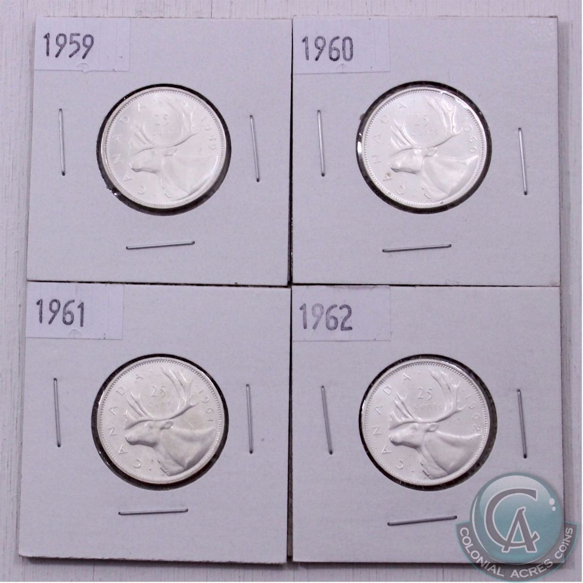Lot of 4x 1959-1962 Canadian 25-cent coins. The dates you will receive are: 1959, 1960, 1961, and the 1962. (4pcs)