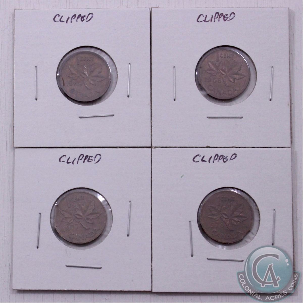 Lot of 4x 1959-1978 Clipped Canadian 1-cent Coins. The dates included in this lot: 1959, 1968, 1977 and 1978. The coins come in a 2x2 white cardboard holders. (4pcs)