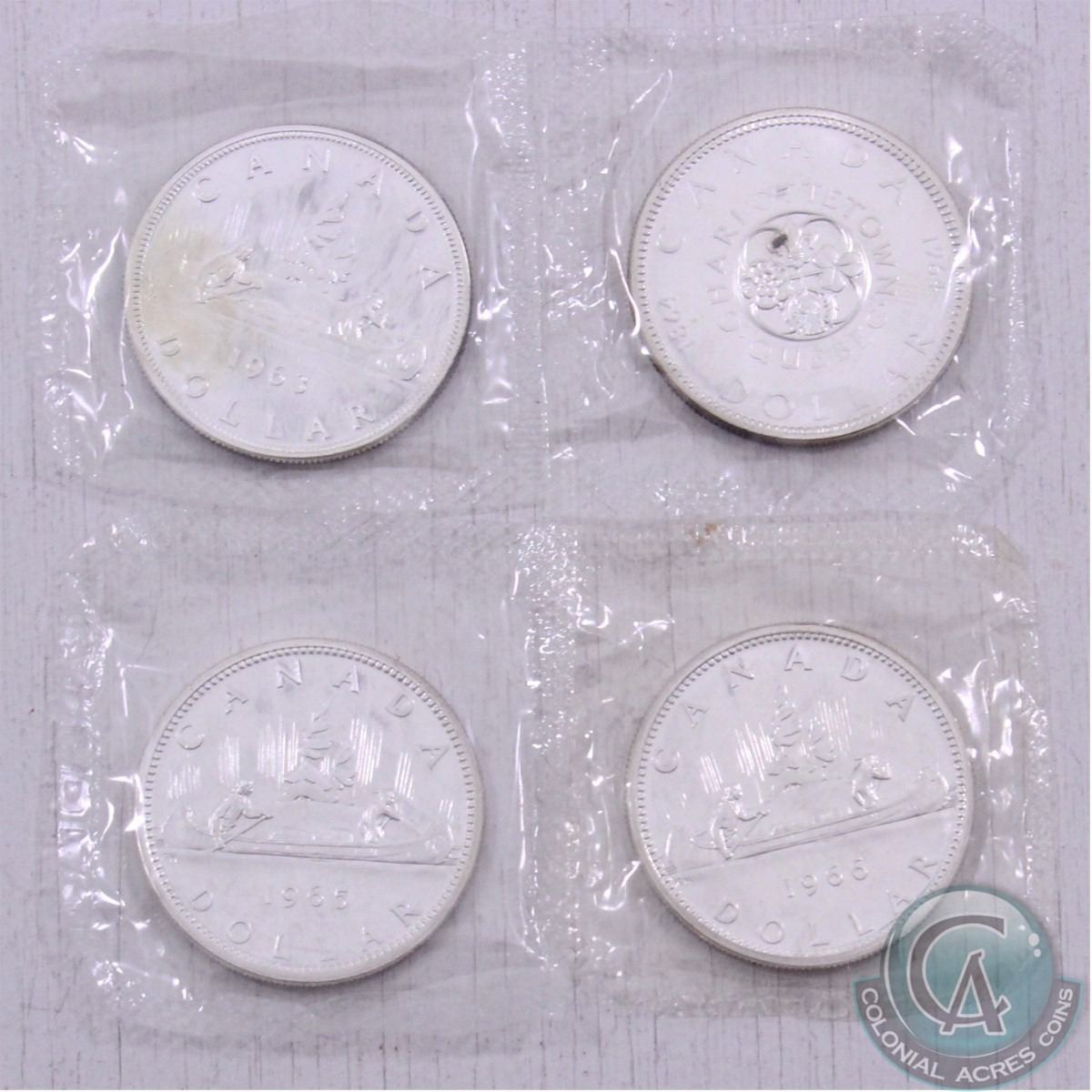 Lot of 4x 1963-1966 Canadian Silver Dollars Sealed in Original Pliofilm. The dates included in this lot are: 1963, 1964, 1965 and 1966. Coins have natural toning. (4pcs)