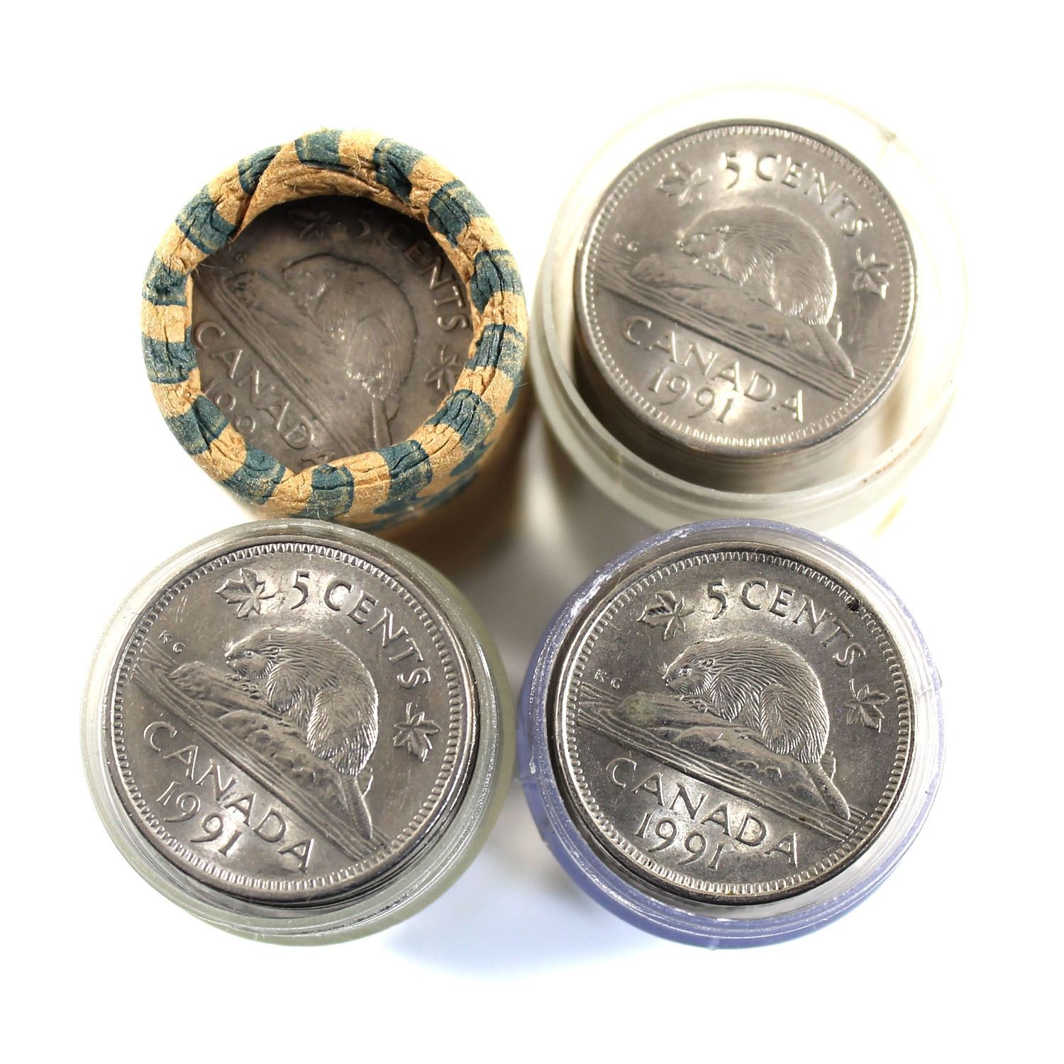Lot of 4x 1991 5-cent Rolls. Coins are in average circulated condition. 4 Rolls