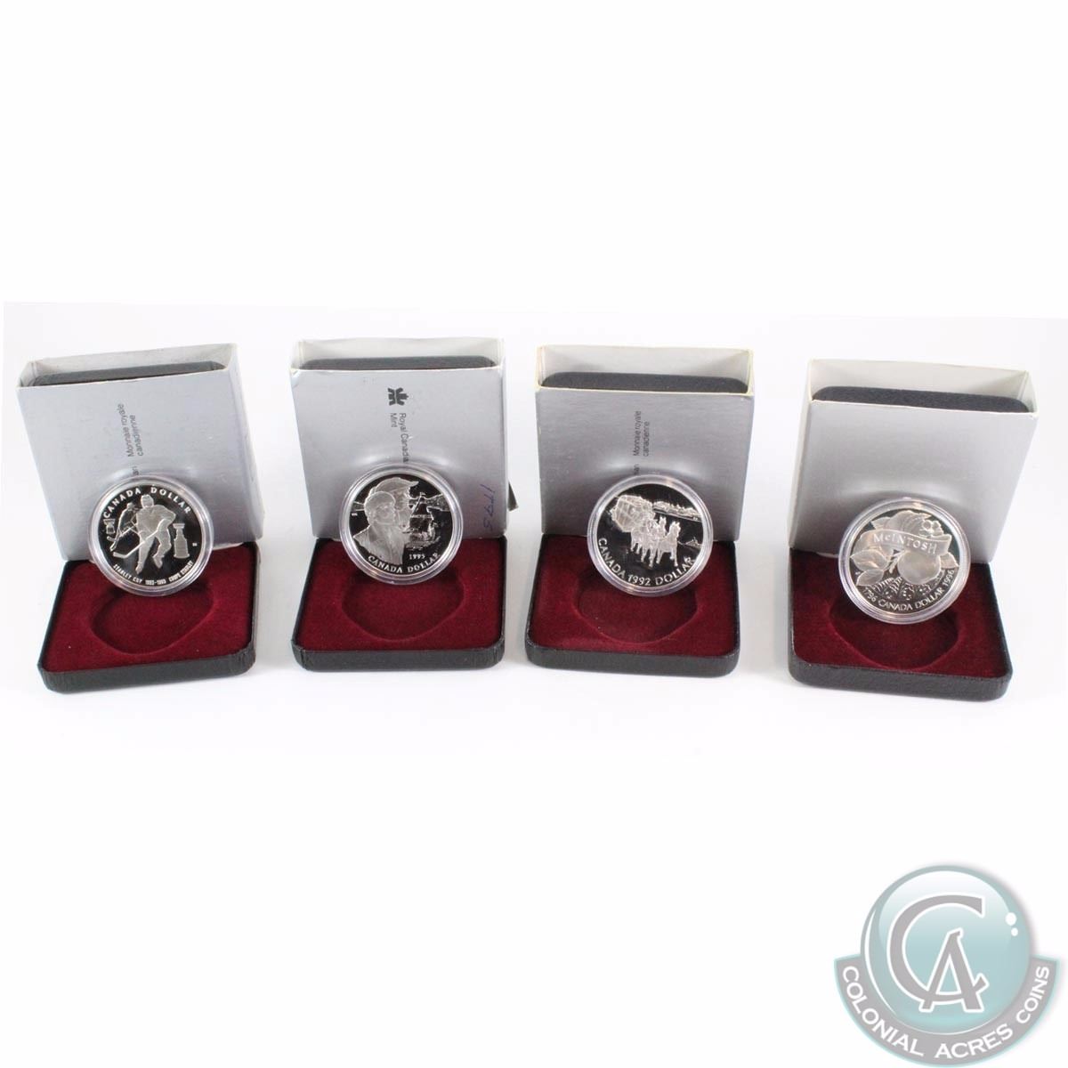 Lot of 4x 1992-1996 Canadian Commemorative Cased Proof Silver Dollars. The dates you will receive are: 1992, 1993, 1995 and 1996. The outer sleeves are lightly worn, however, the coins come with original packaging. (4pcs)