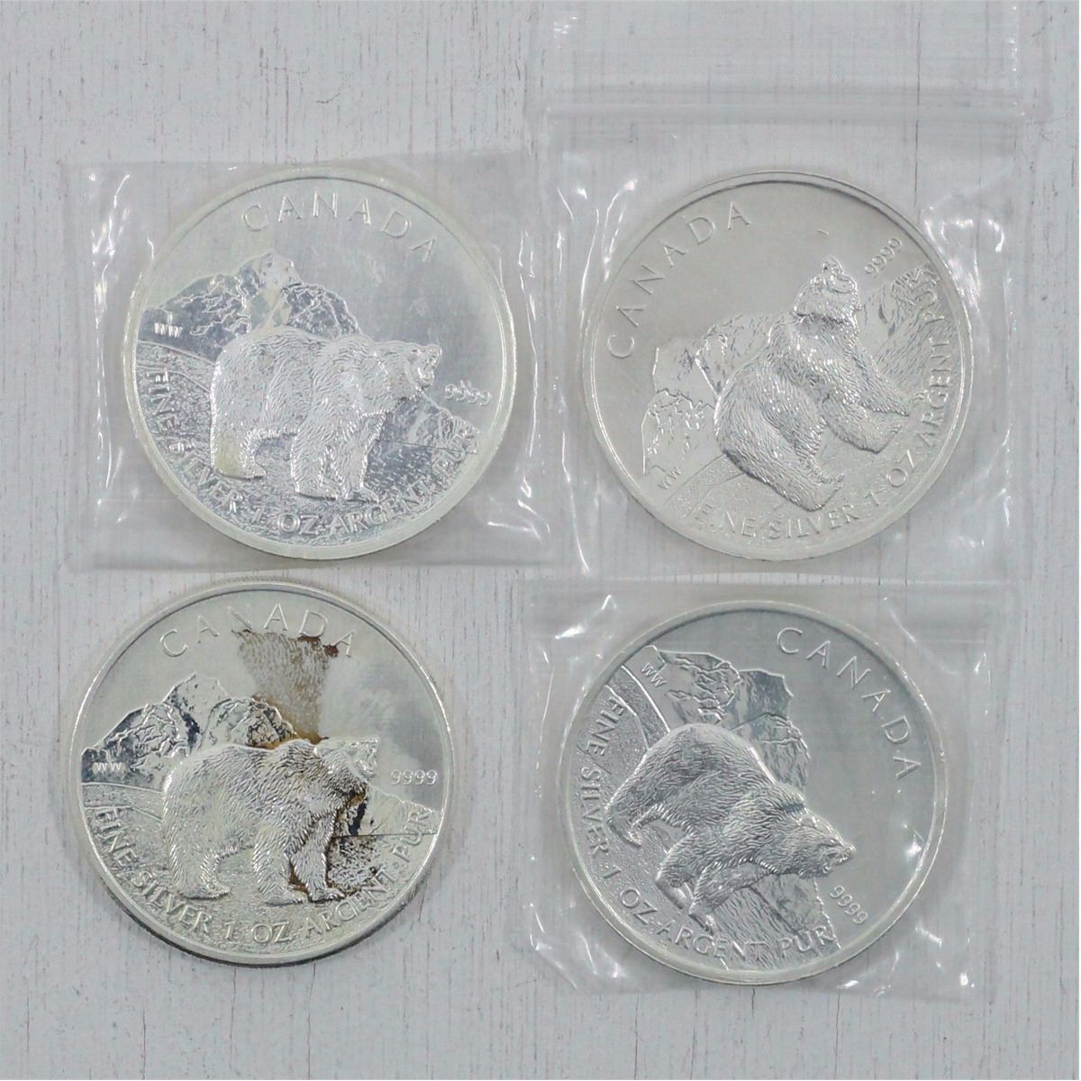 Lot of 4x 2011 Great Grizzly 1oz .9999 Fine Silver Maple Leaf coin. (Tax Exempt). Buyers Premium will be added on all items as per our terms of sale. We accept Paypal, Credit Card, E-Transfer Payments, Cheque or Money Orders (there is an additional 3% fee for using Paypal or Credit Card). All invoices will be emailed immediately following the auction, please contact us if you would like to pay by credit card or receive a new revised lower total for mailing in payment or sending an e-transfer (3% discount). All Items Are Sold "AS IS", no returns