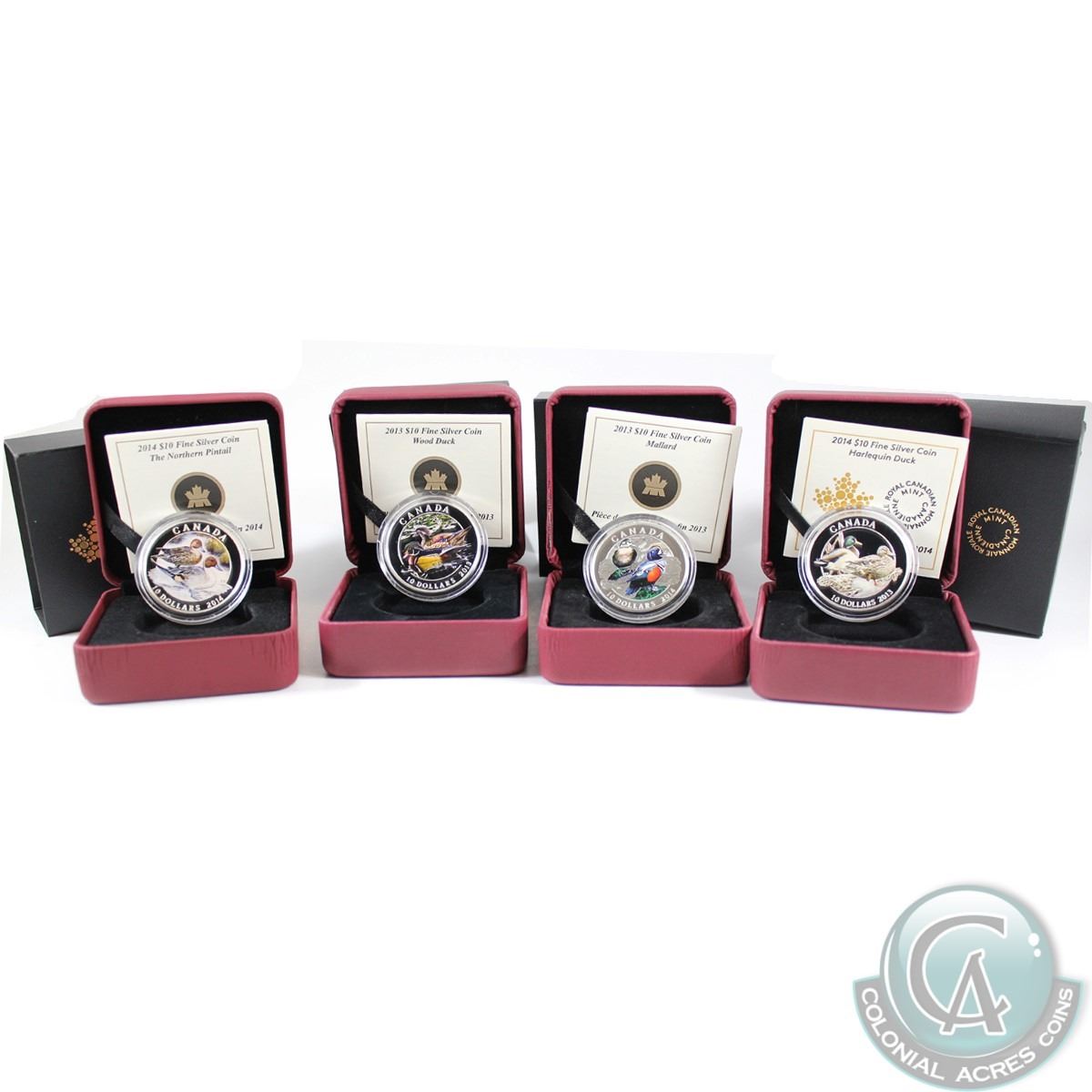Lot of 4x 2013-2014 $10 Ducks of Canada Fine Silver Coins. You will receive: 2013 Mallard (RCM Display is slightly too large for the capsule), 2013 Wood Duck, 2014 Pintail & 2014 Harlequin Duck (some capsules may be lightly scratched). 4pcs (TAX Exempt)