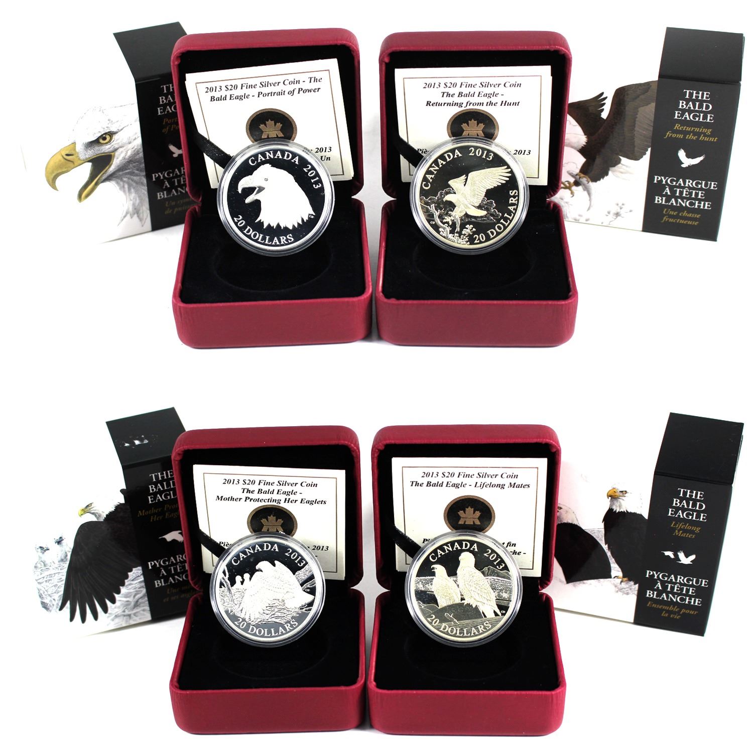 Lot of 4x 2013 Canada $20 The Bald Eagle Series. Includes all 4 unique designs: Portrait of Power, Lifelong Mates, Returning from the Hunt, and Mother Protecting Her Eaglets. Coins and packaging have various imperfections.