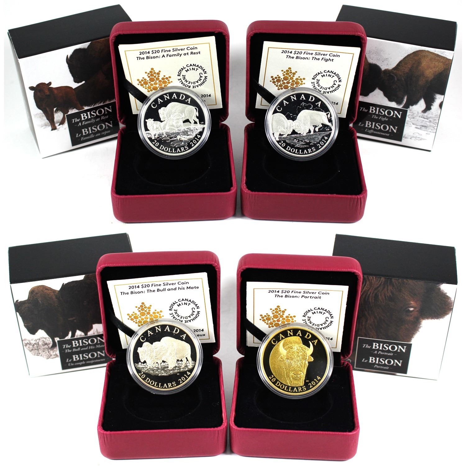 Lot of 4x 2013 Canada $20 The Bison Series. Includes all 4 unique designs: The Bull and His Mate, The Fight, A Family at Rest, and A Portrait. Coins and packaging have various imperfections.
