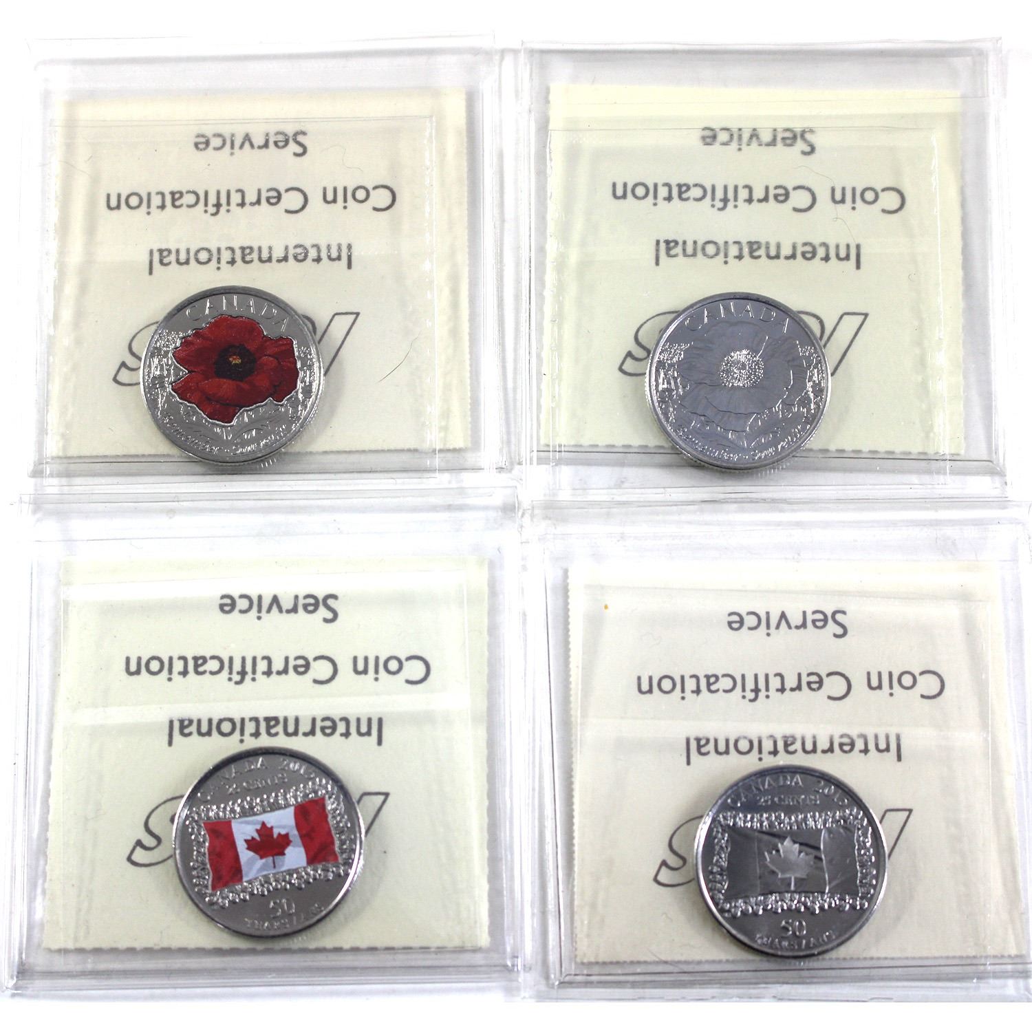Lot of 4x 2015 Canada 25-cent ICCS Certified MS-65 to MS-66. Lot Includes: Poppy MS-66; Poppy-Colour MS-65; & 2x Flag 50 Years MS-65 (Regular & Colour). 4pcs.