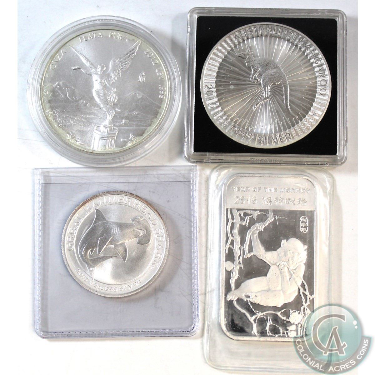 Lot of 4x .999 Fine Silver Coins/Bar. You will receive 2016 Australia 1oz Kangaroo, 2012 Mexico Libertad, 2015 Australia 1/2oz Hammerhead Shark & 2016 1oz Year of the Monkey Bar (Coins are toned). 4pcs (TAX Exempt)