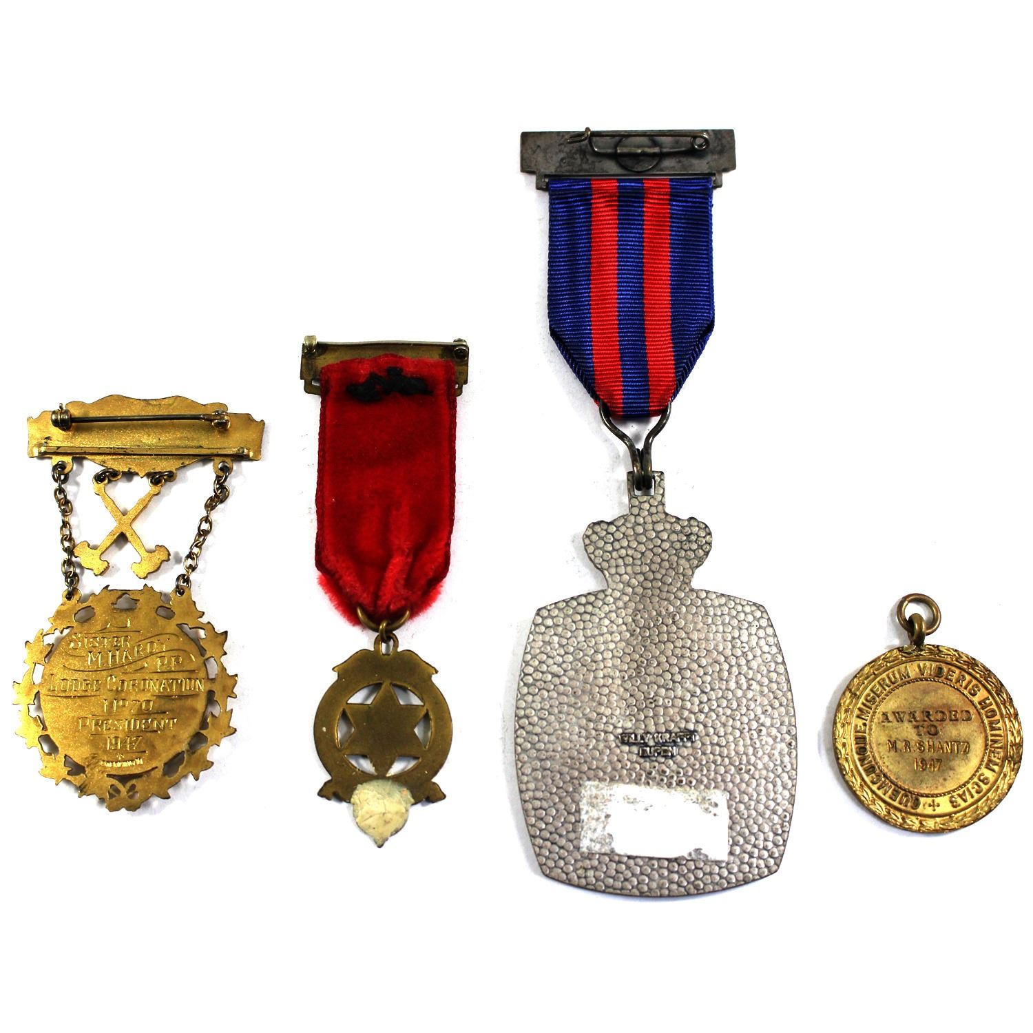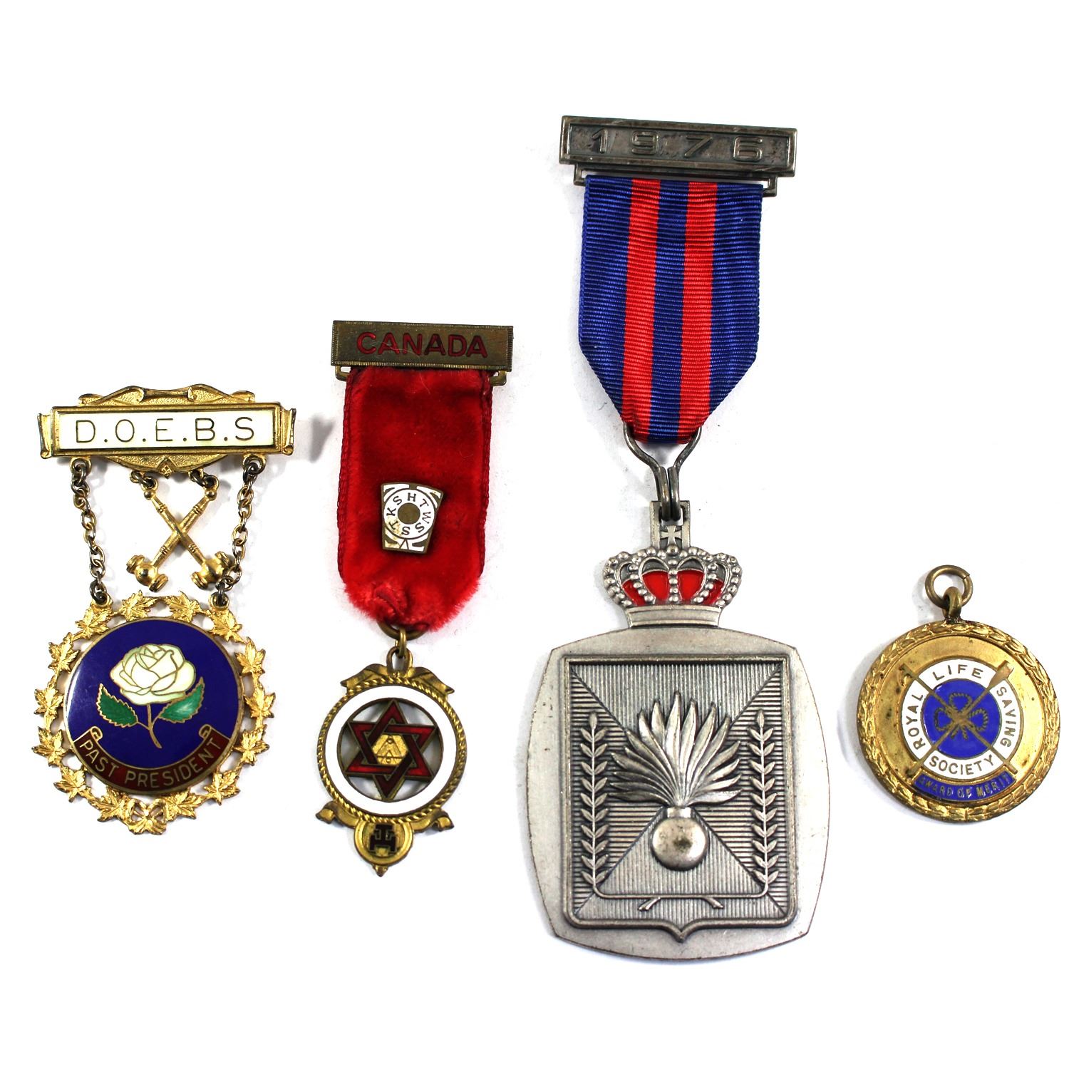Lot of 4x Assorted Non-Military Medals. Includes Royal Life Saving Society inscribed "M.R. Shantz 1947", DOEBS Past President Pin inscribed "Sister M. Hardy P.P. Lodge Coronation No 70 President 1947", Canada HTWSSTKS Masonic Medal with Red Velvet Ribbon, and 1976 Flaming Grenade Medal with Original Ribbon. Some medals have minor corrosion related to age. Some residue related to prior mounting.