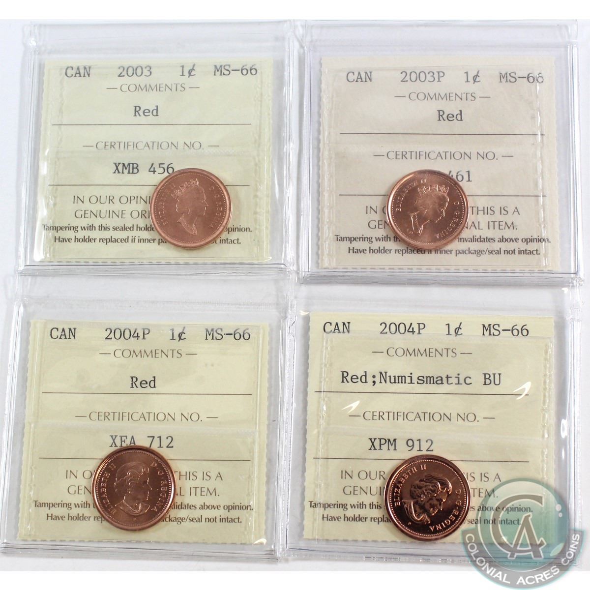 Lot of 4x Canada 1-cent ICCS Certified MS-66 Dated 2003 Old Effigy, 2003P Old Effigy, 2004P & 2004P NBU. 4pcs