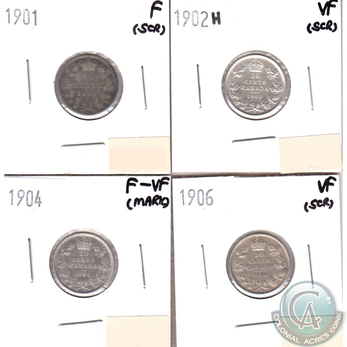 Lot of 4x Canada 10-cent Dated 1901, 1902H, 1904 & 1906 in Fine to VF (coins have various impairments). 4pcs